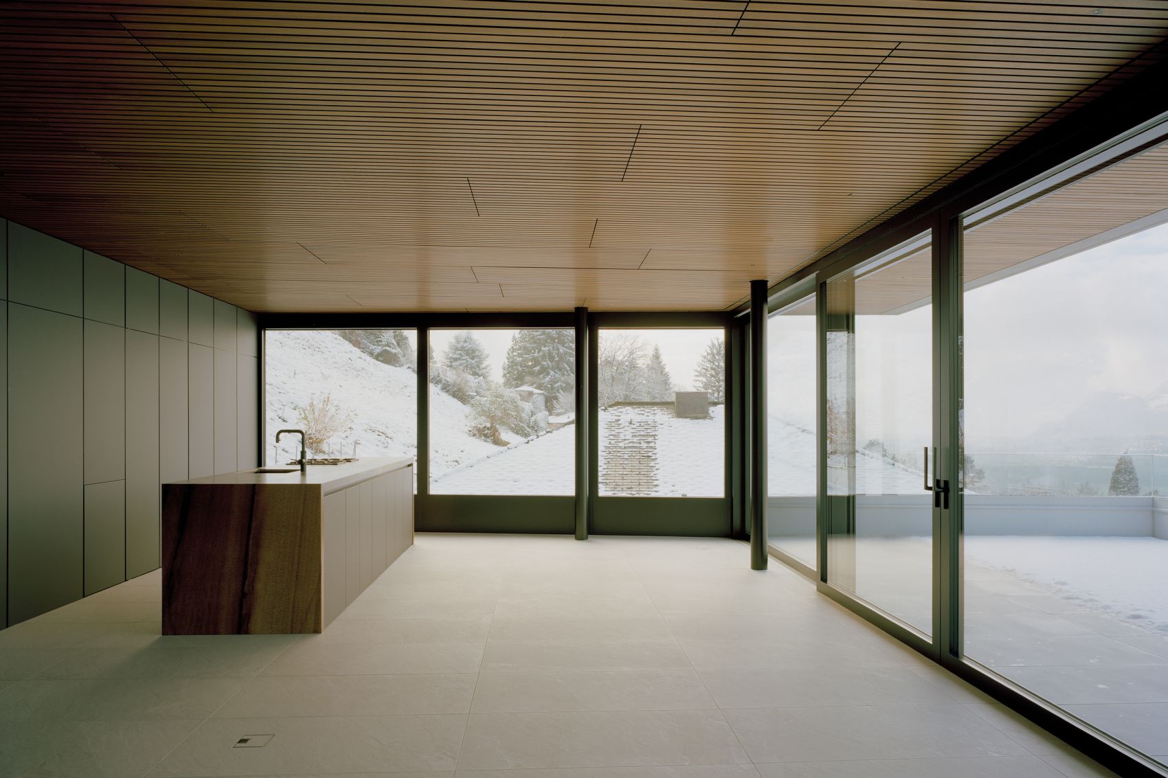 In Laax wurden die Fenster beim Poolhaus noch vor dem grossen Schnee eingebaut und der Anbau somit Winterfest gemacht. Die Aussicht aus dem Wohnraum wird durch die Sky-Frame Verglasung ideal in Szene gesetzt.