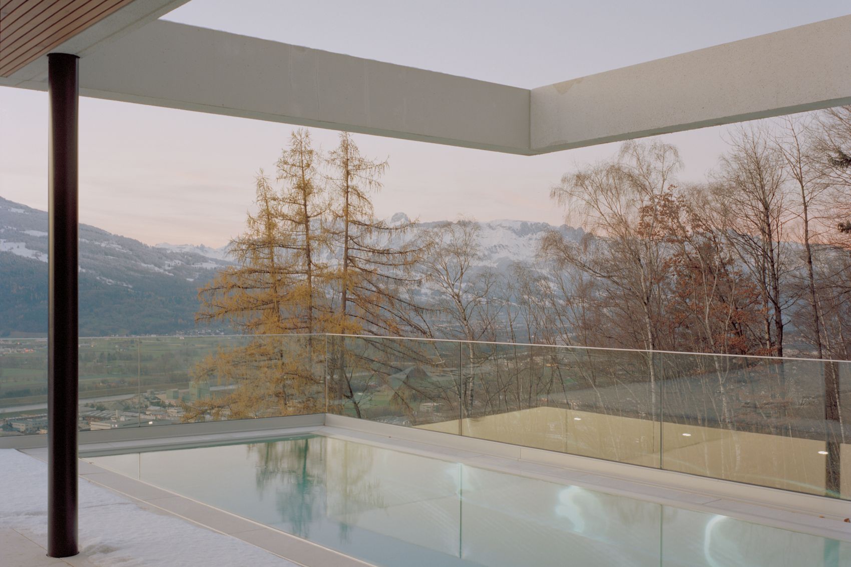 Das Poolhaus mit seinem Kupferdach fügt sich harmonisch in die Winterlandschaft ein. Durch die rahmenlosen Fenster kommt der Innenbereich noch mehr zur Geltung. Das Abendrot trägt zur einzigartigen Atmosphäre an diesem Tag in Laax bei.