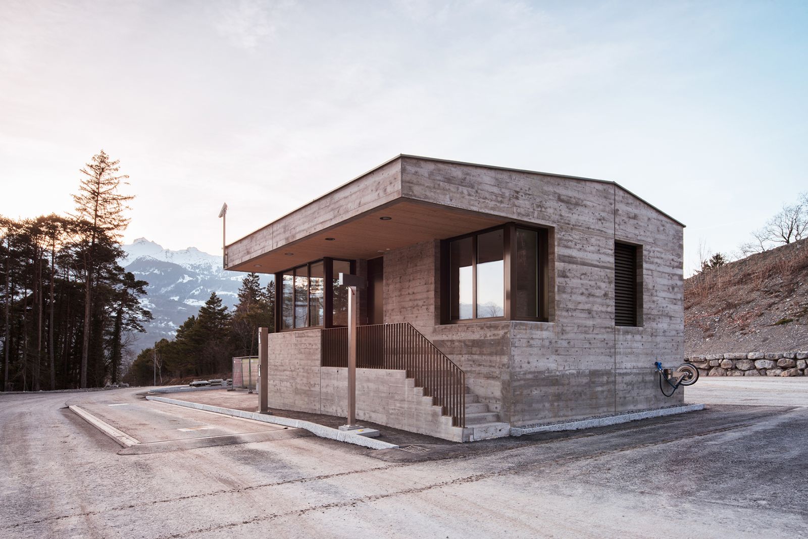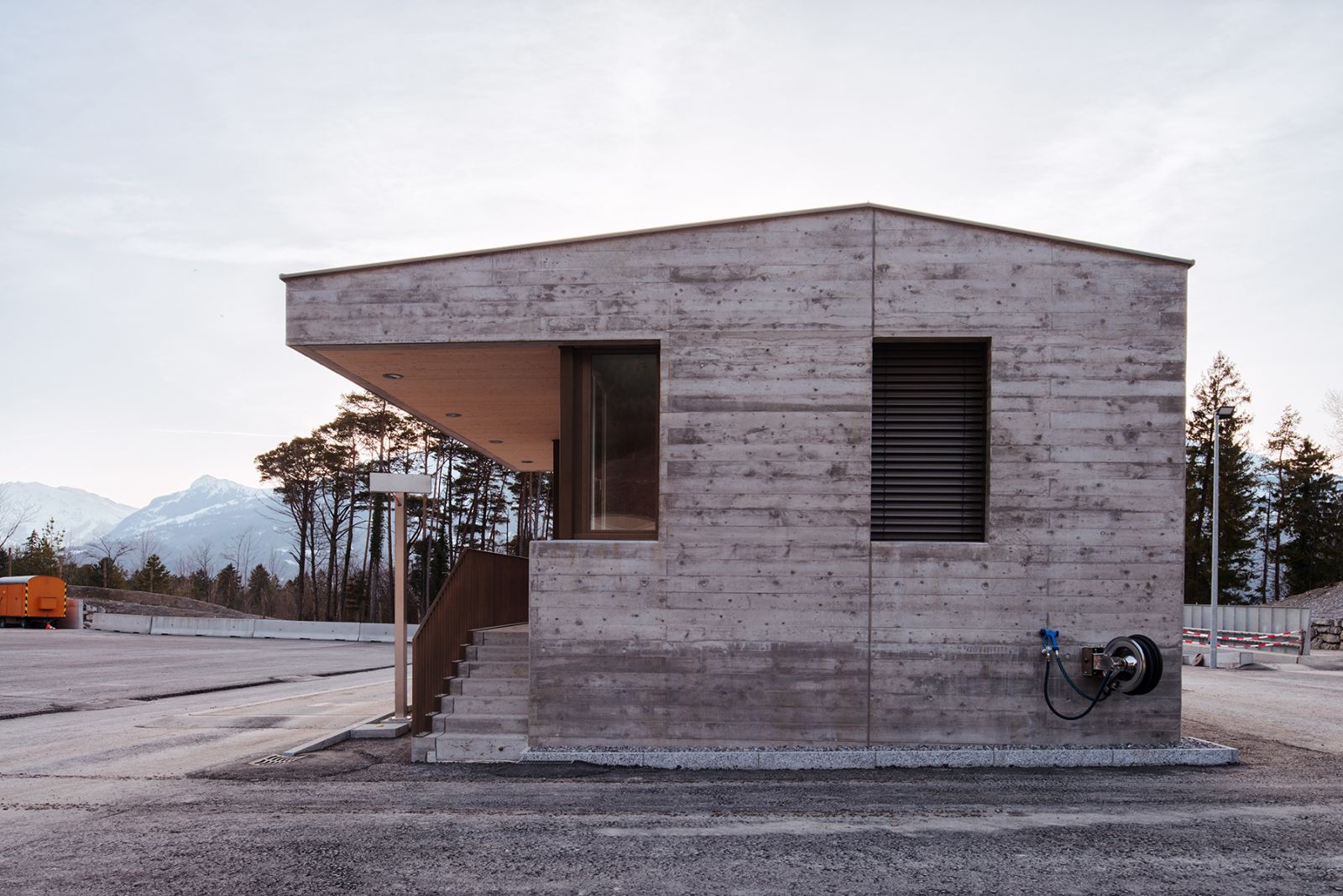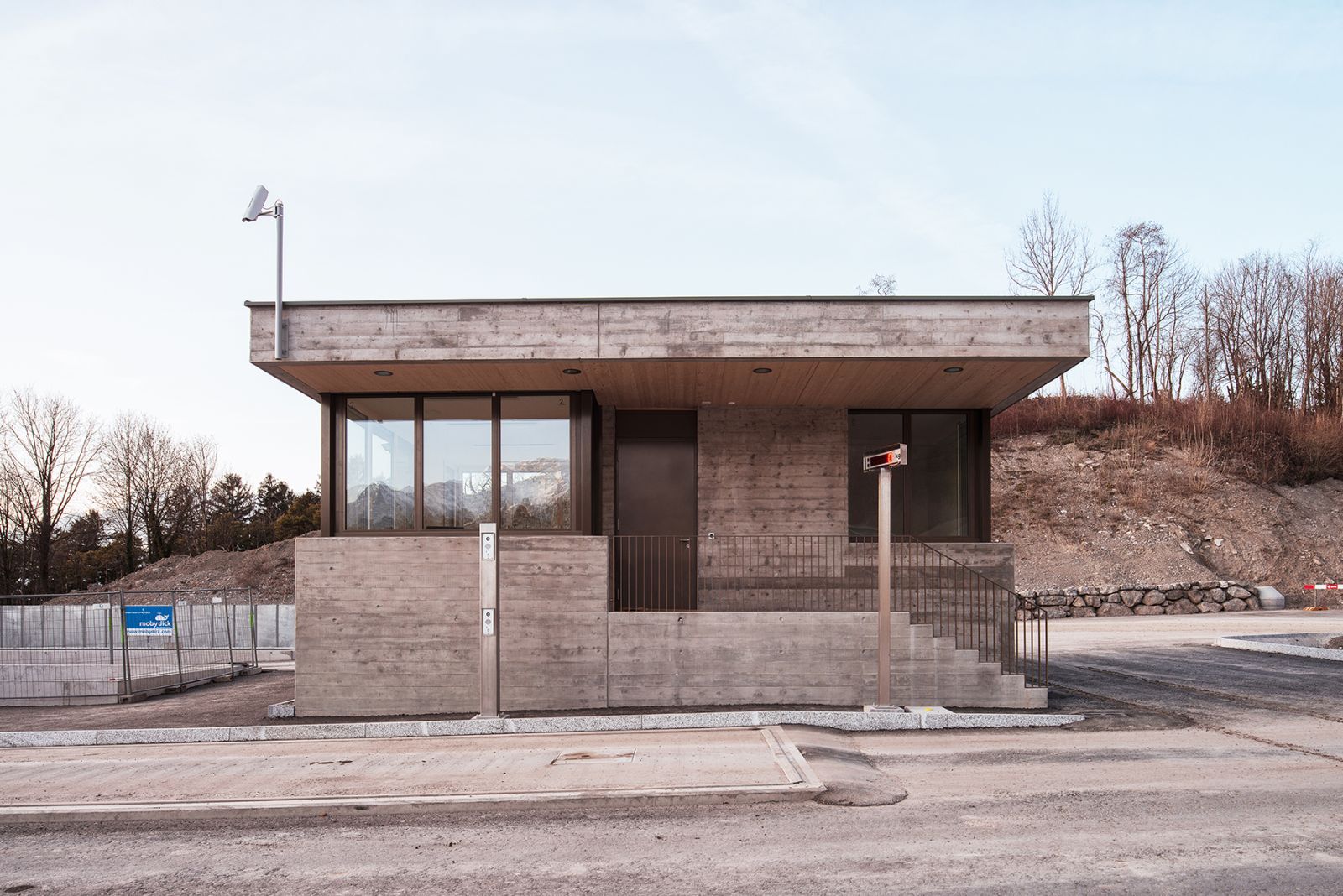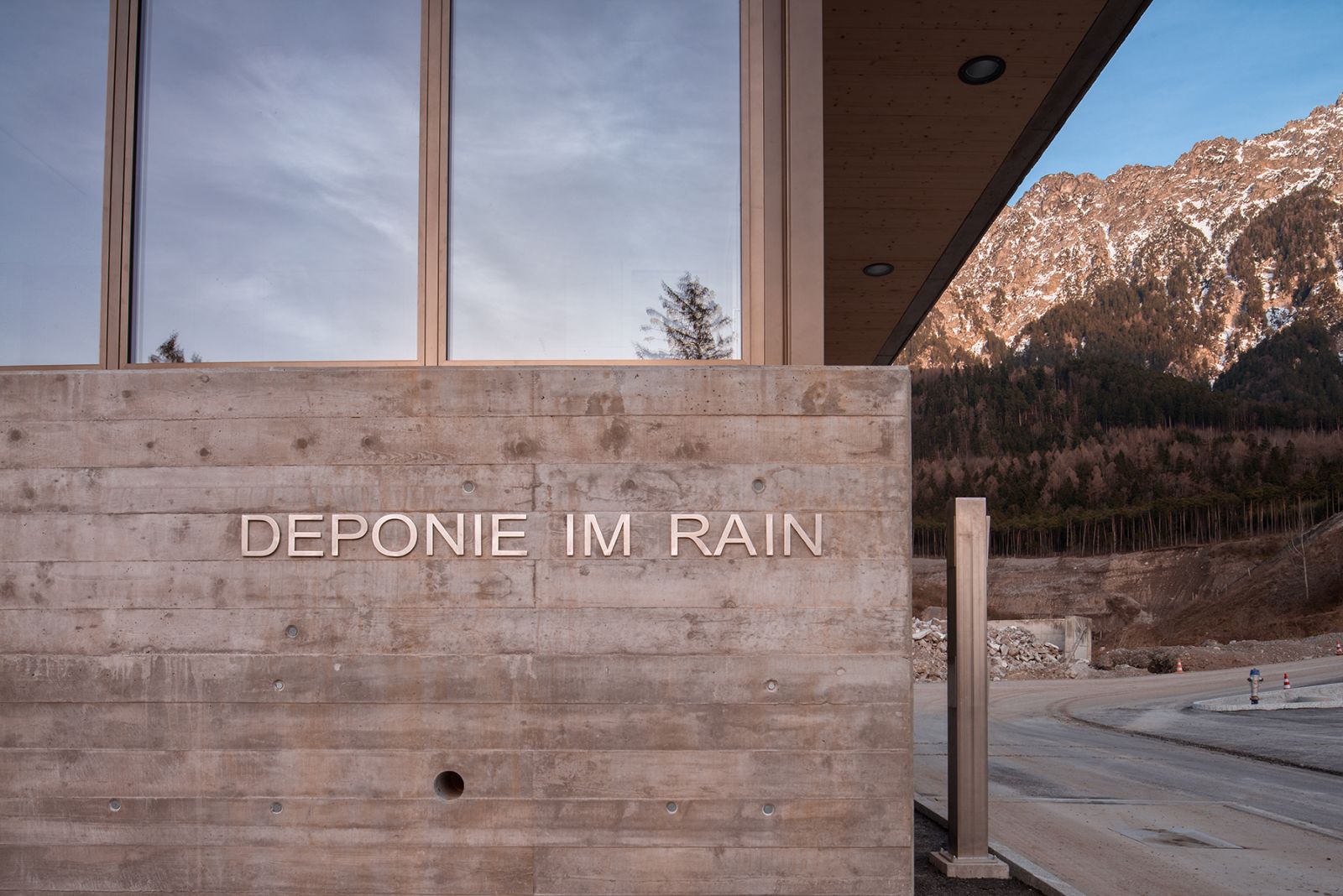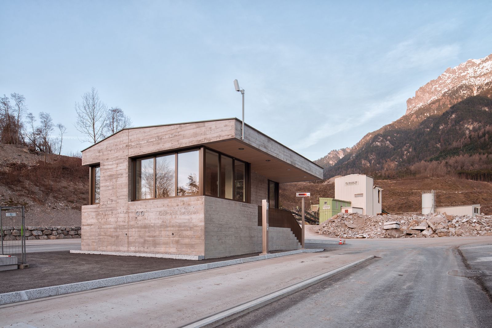 Die Deponie im Rain wird als Gesamtanlage komplett umstrukturiert. Teil dieses Gesamtprojektes ist die neue Deponiewarte welche zentral in dem projektierten Gebiet steht. Sie dient als Arbeitsplatz für den Deponiewart und schafft Lagerflächen für diverse Arbeitsgeräte. Ebenfalls beherbergt das Gebäude sämtliche technischen Anlagen für die Reifenwaschanlage und die Objektwaage. Der Stein im Kontext wird durch die Architektursprache des Sichtbetons aufgenommen.