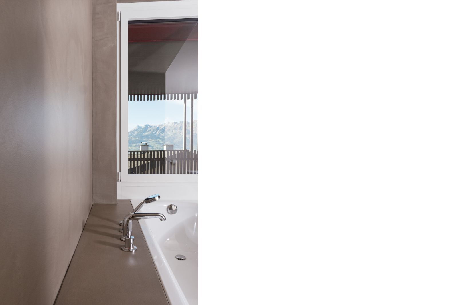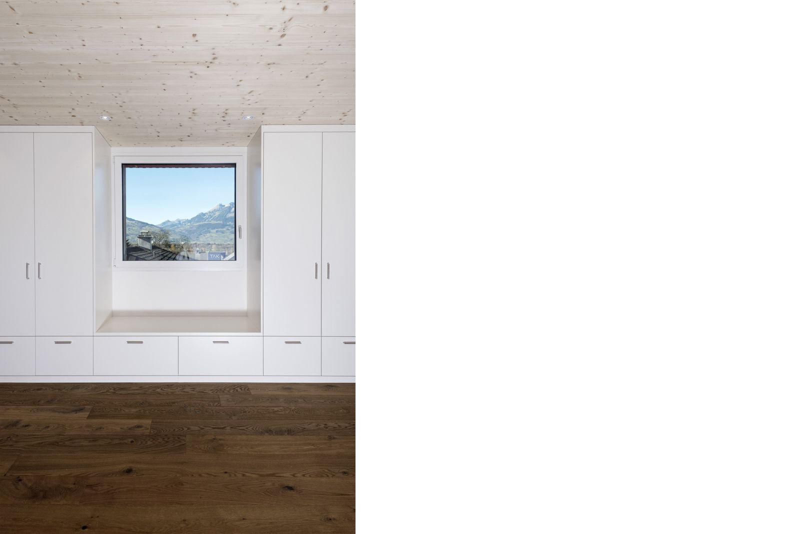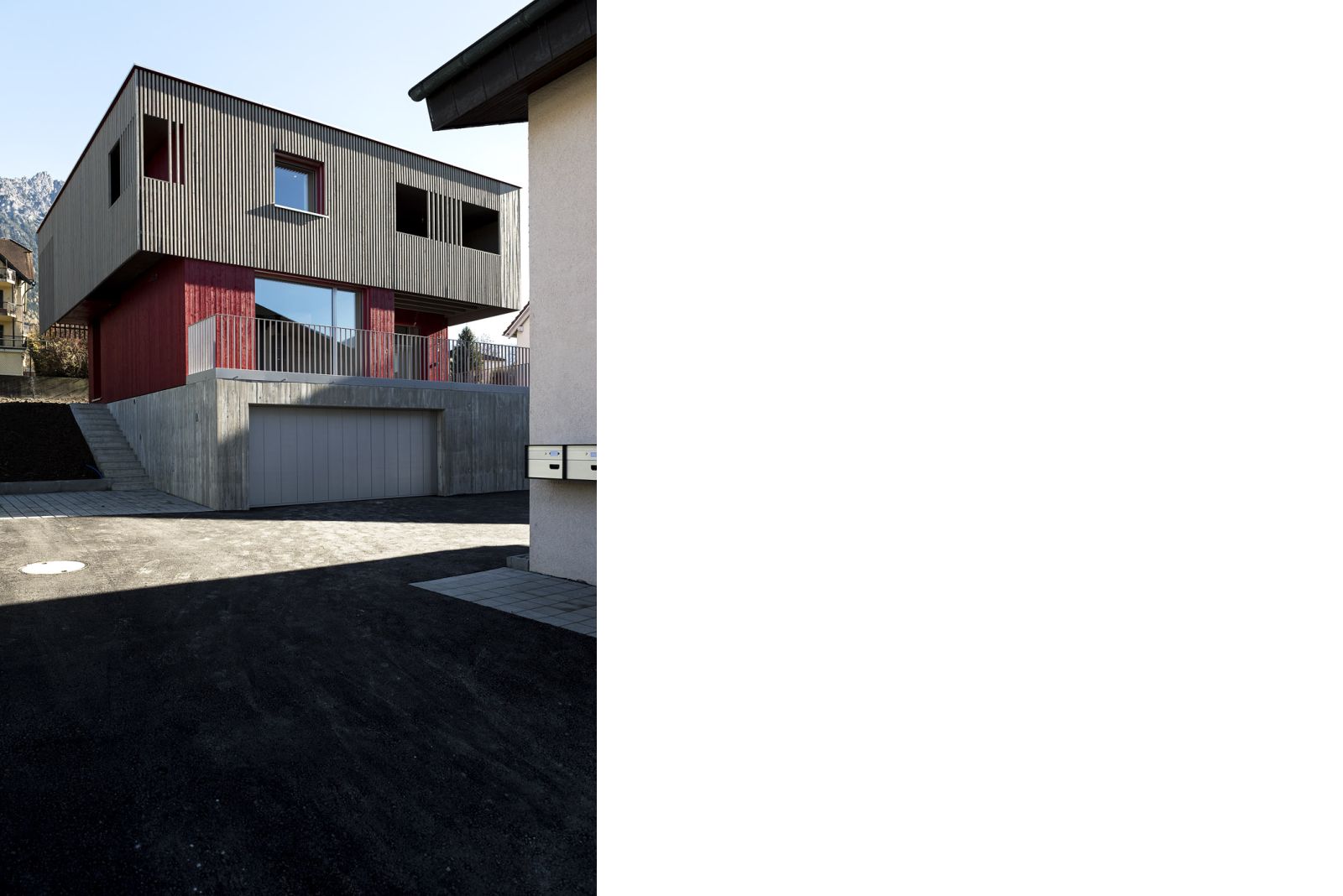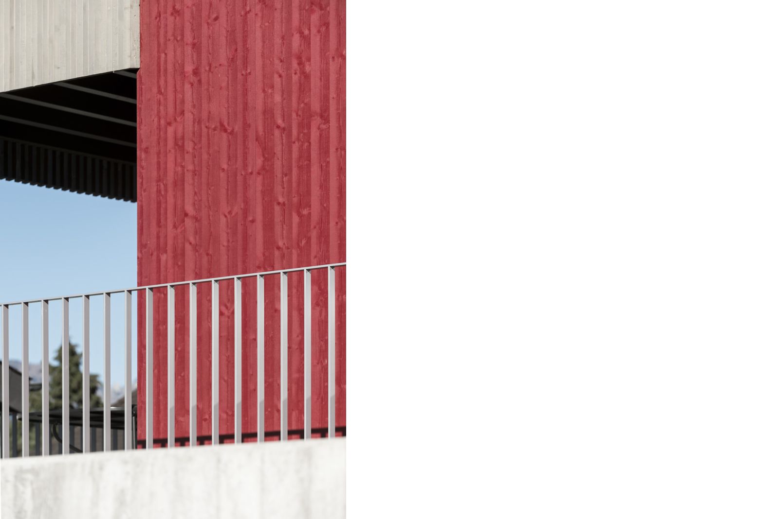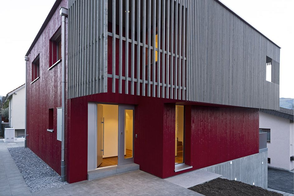 Die drei Geschosse des Einfamilienhauses sind in ihrer Architektursprache und Materialität klar voneinander getrennt. Der in Sichtbeton errichtete Sockel fügt sich in die am Hang liegende Parzelle ein. Der darauf erstellte Holzelementbau sticht besonders im Erdgeschoss durch seine rote Farbe hervor. Die Holzschalung spielt im Obergeschoss mit der Transparenz und lässt die farbliche Erscheinung stellenweise durchblicken.