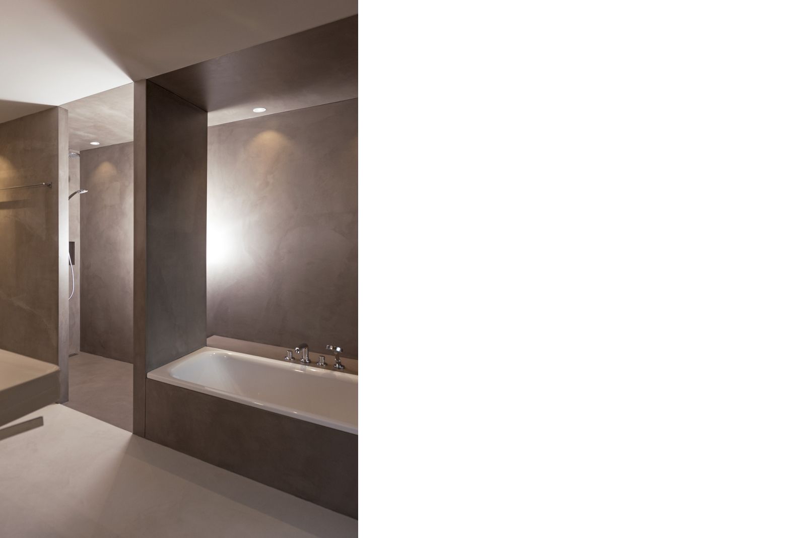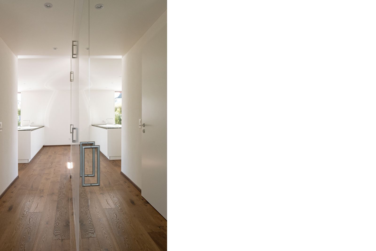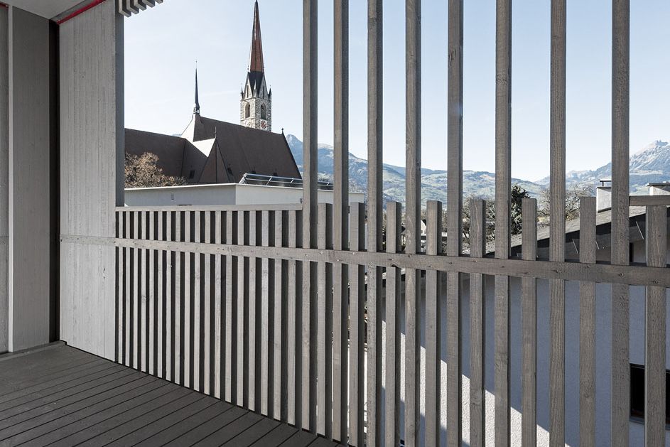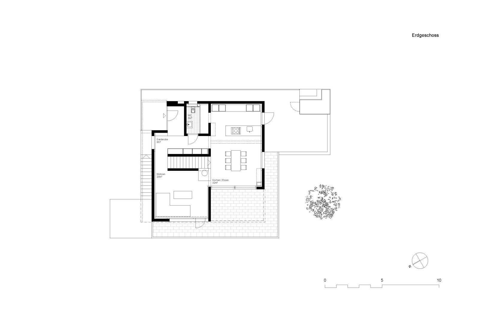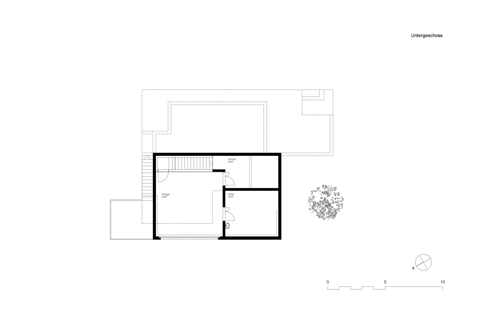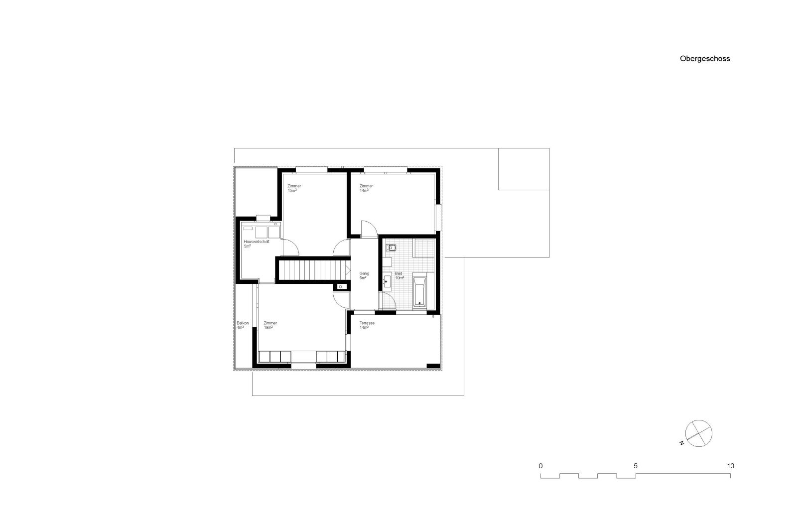 Die drei Geschosse des Einfamilienhauses sind in ihrer Architektursprache und Materialität klar voneinander getrennt. Der in Sichtbeton errichtete Sockel fügt sich in die am Hang liegende Parzelle ein. Der darauf erstellte Holzelementbau sticht besonders im Erdgeschoss durch seine rote Farbe hervor. Die Holzschalung spielt im Obergeschoss mit der Transparenz und lässt die farbliche Erscheinung stellenweise durchblicken.