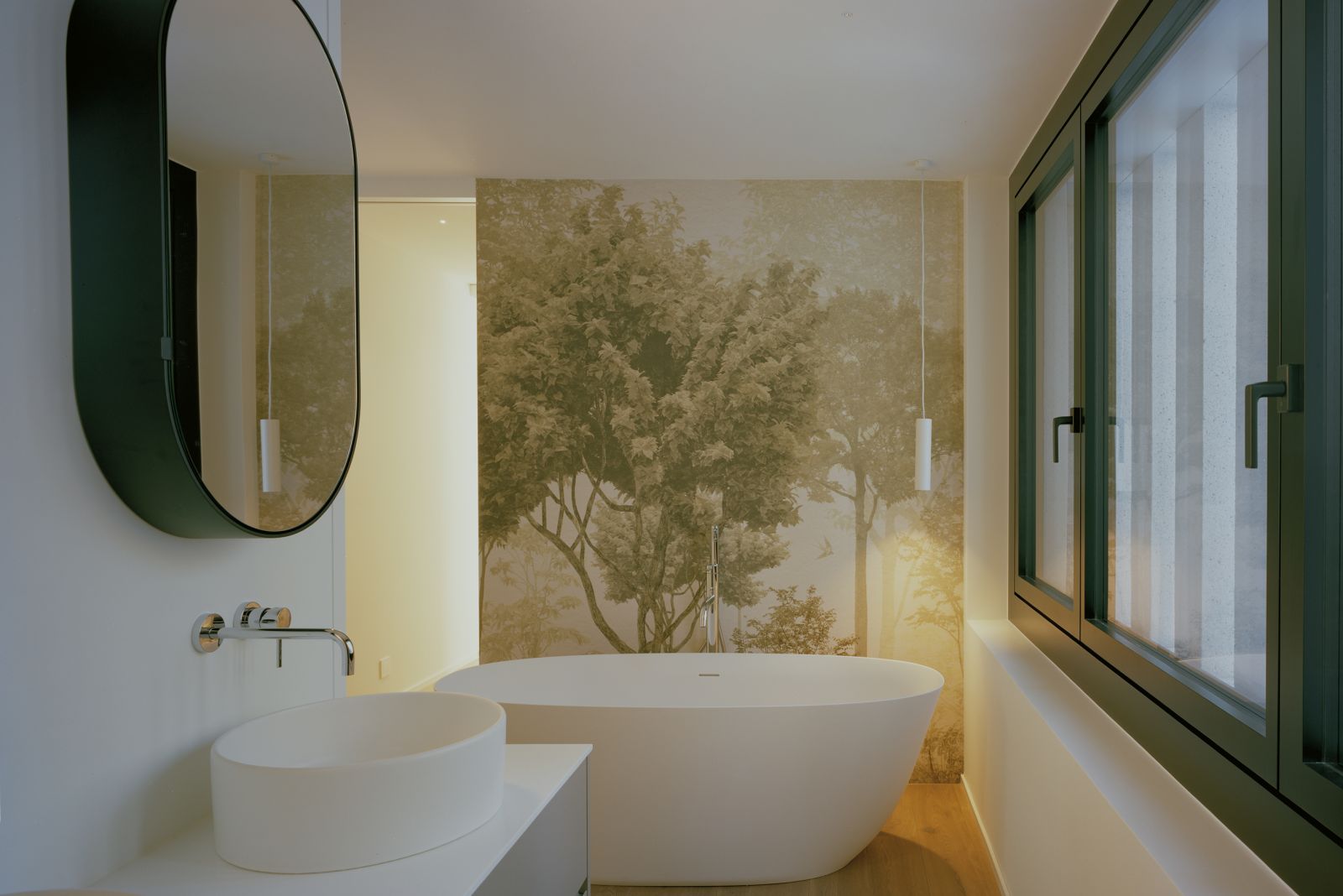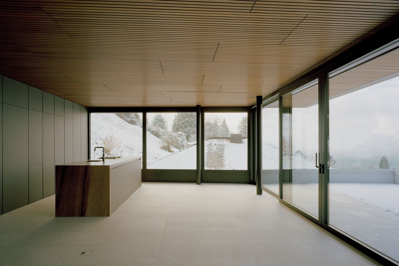 Die architektonische Sprache ist bewusst zurückhaltend. Glatte, ruhige Fassadenflächen und konsequent geführte Kanten betonen die klare Geometrie. Transparente Brüstungen und grosszügige Öffnungen sorgen für Leichtigkeit und lassen Innen- und Aussenraum visuell ineinander übergehen. Die Terrassen werden so zu Erweiterungen der Wohnbereiche und bilden je nach Nutzung unterschiedliche Zonen – vom geschützten Aufenthalt bis zur offenen Aussichtslage.