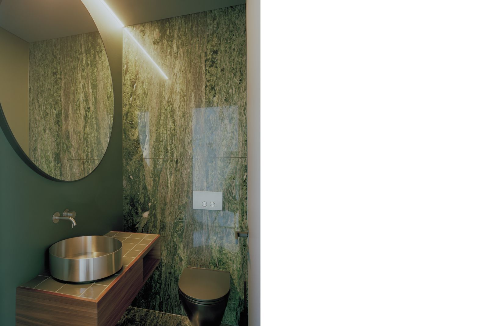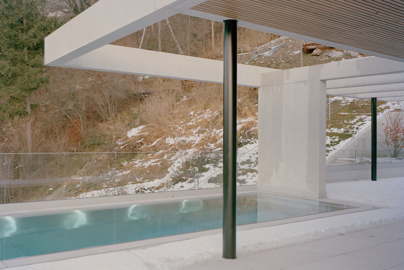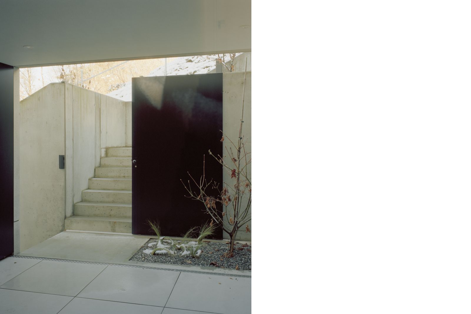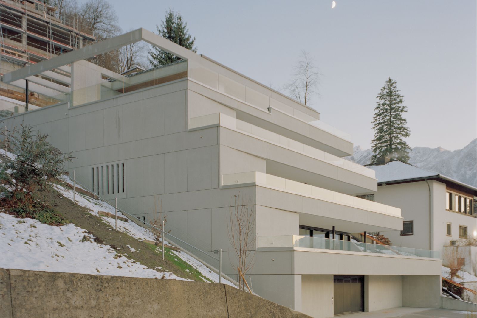 Haus Mazor ist ein präzise gegliederter Neubau in Hanglage realisiert. Der Baukörper entwickelt sich in klaren, horizontalen Schichten und reagiert damit direkt auf die Topografie: Rücksprünge und auskragende Ebenen staffeln das Volumen, reduzieren die wahrgenommene Höhe und erzeugen grosszügige Aussenräume mit hoher Aufenthaltsqualität.