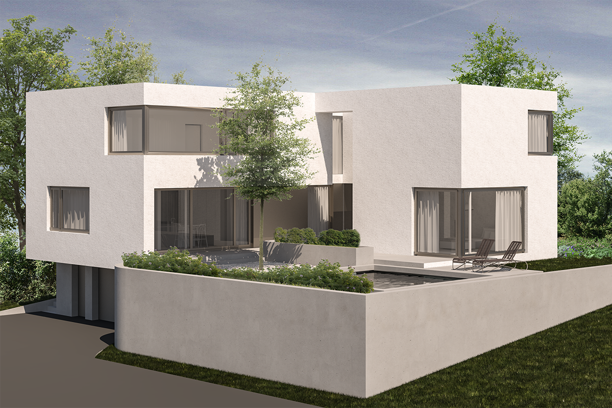 Das dreigeschossige Wohnhaus ist in seiner Nutzung klar aufgeteilt. Die auf Strassenniveau liegenden Räume dienen der Parkierung sowie den internen Abläufen. Die stärker genutzten Räume werden durch einen Lichthof belichtet. Die im Gartengeschoss liegenden Räume werden durch den Wohnhof sowohl akustisch als auch optisch voneinander getrennt. Der in unterschiedliche Bereiche gegliederte Aussenraum schafft verschiedene Raumqualitäten.