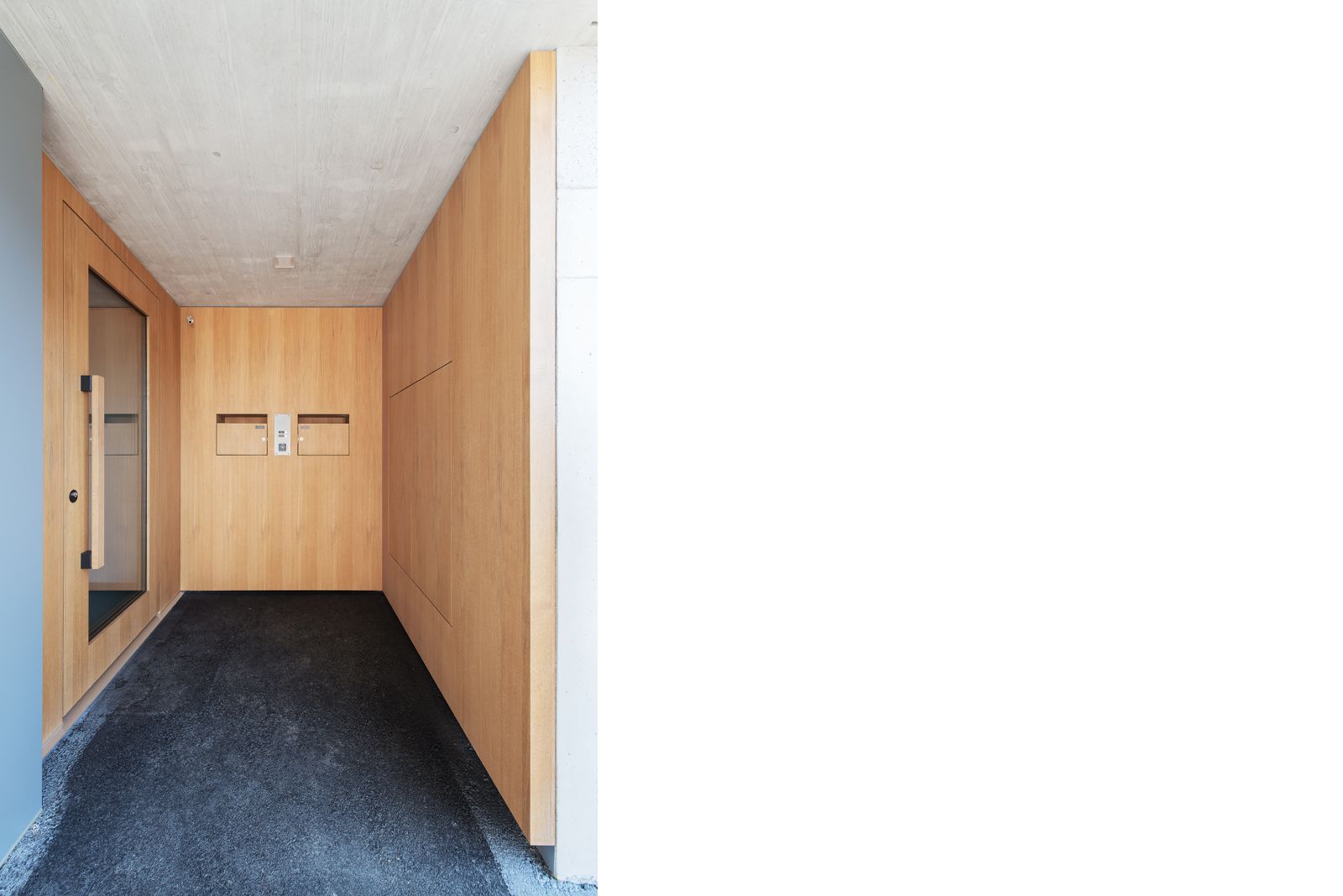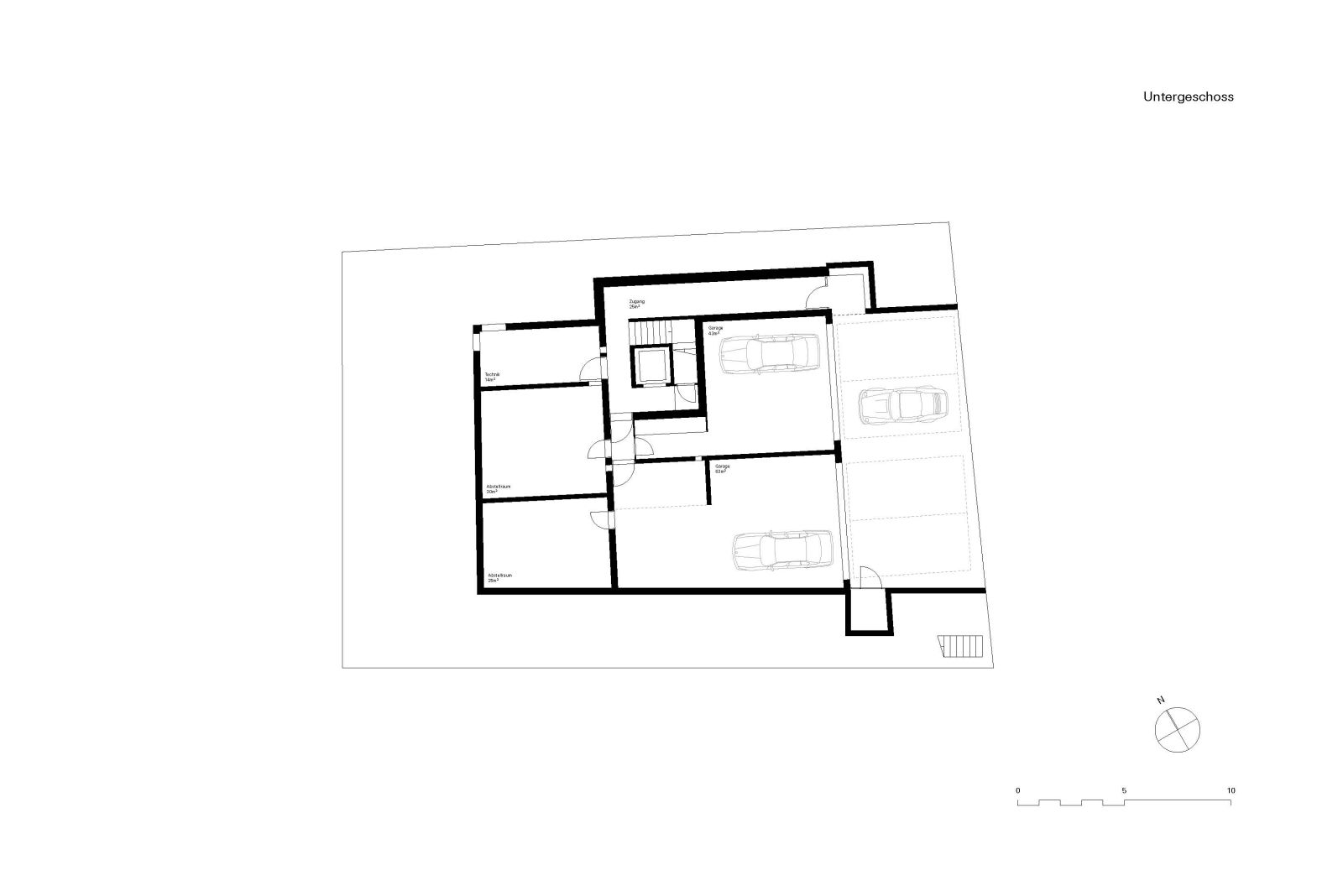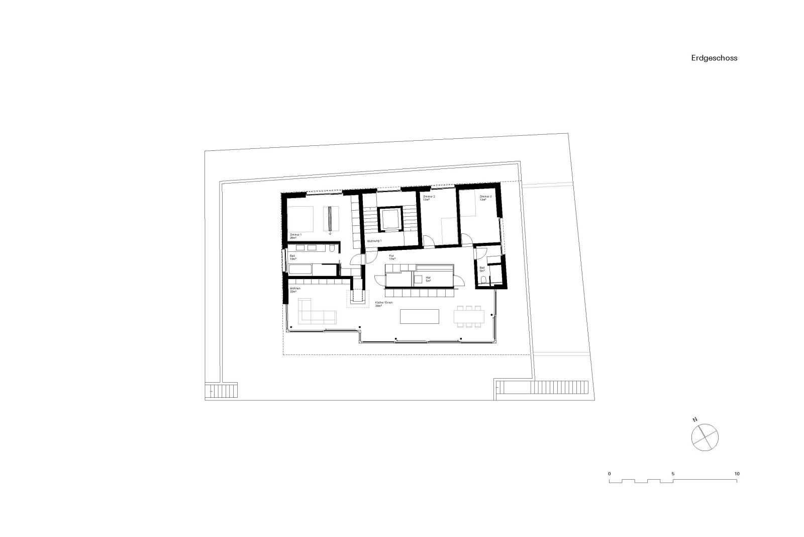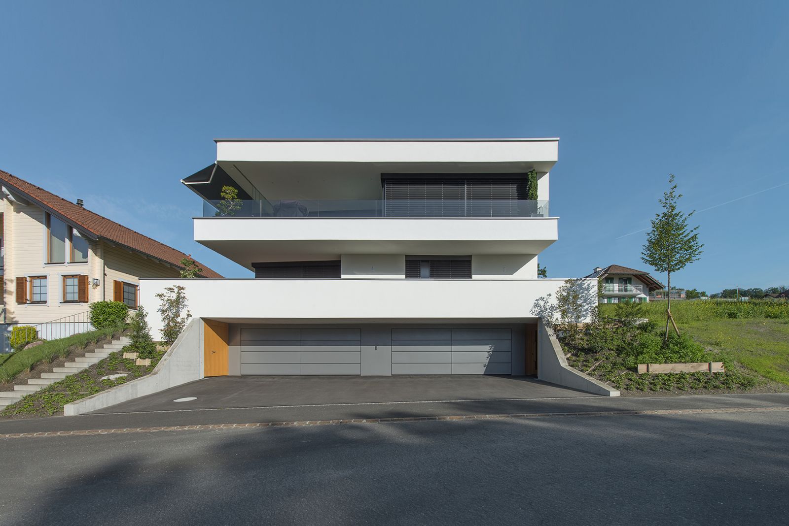 Zwei Geschosswohnungen mit jeweils circa 160 Quadratmeter waren die Grundanforderungen für dieses Mehrfamilienhaus. Aus den Grundstückslinien heraus ergibt sich eine Gebäudeform, die sich wie zwei Spangen auseinander biegt und in deren Mitte ein Kern steht, der komplett umrundet werden kann. Dadurch wird der Innenraum aufgebrochen und es bilden sich spezielle Raumabfolgen. Durch die Hanglage kann das Gebäude ebenerdig im Untergeschoss mit einer Tiefgarage erschlossen werden. Ein Treppenhaus erschliesst beide Geschosswohnungen.