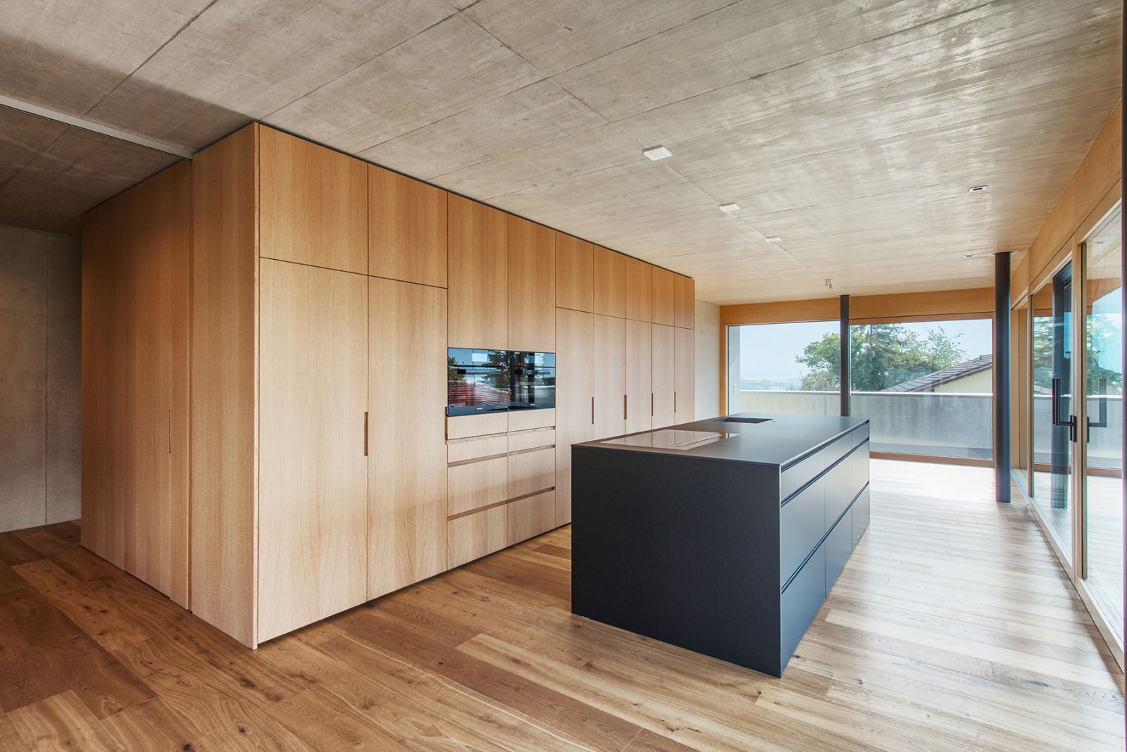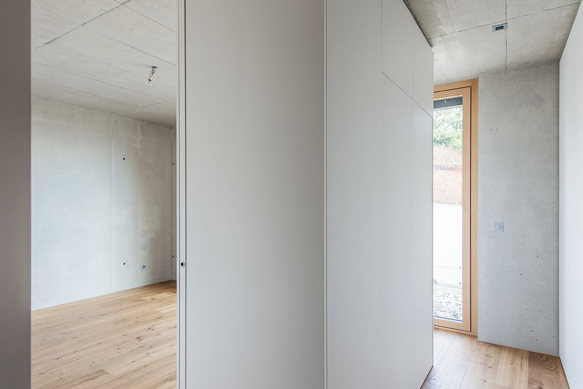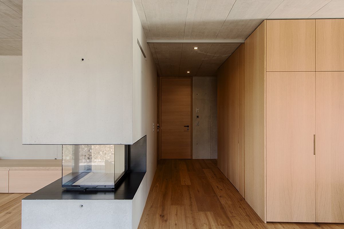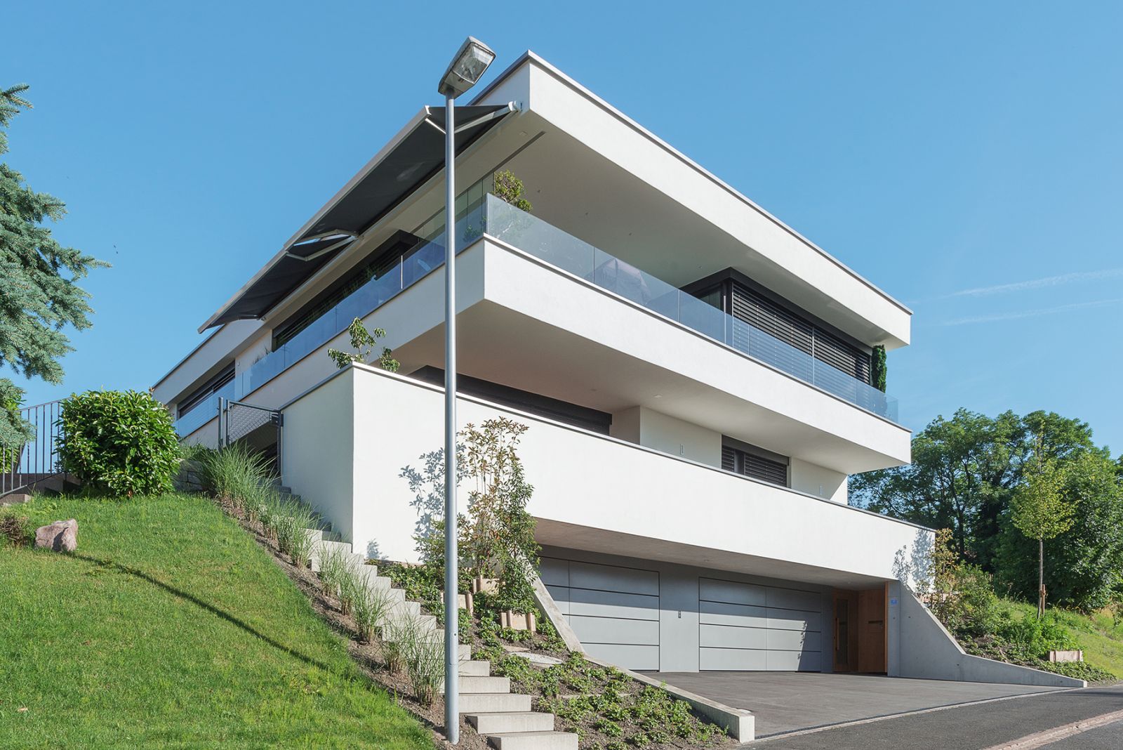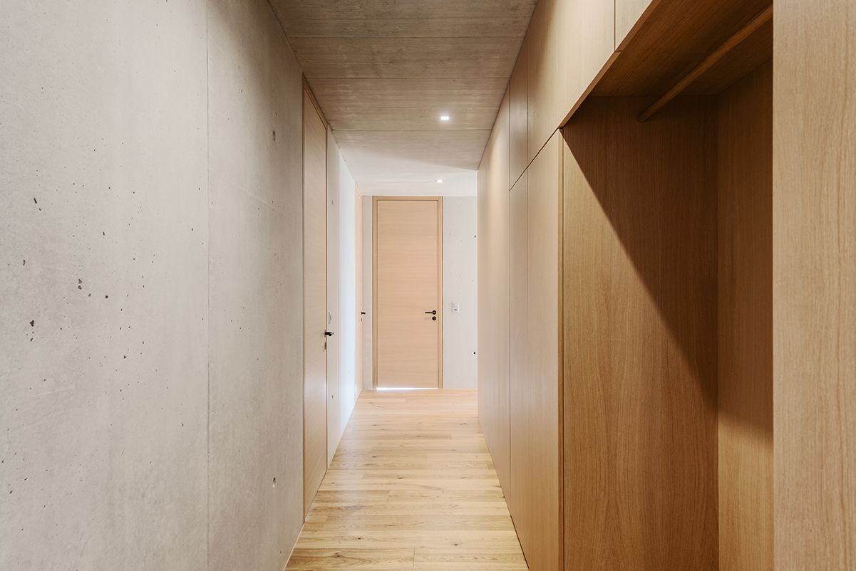 Zwei Geschosswohnungen mit jeweils circa 160 Quadratmeter waren die Grundanforderungen für dieses Mehrfamilienhaus. Aus den Grundstückslinien heraus ergibt sich eine Gebäudeform, die sich wie zwei Spangen auseinander biegt und in deren Mitte ein Kern steht, der komplett umrundet werden kann. Dadurch wird der Innenraum aufgebrochen und es bilden sich spezielle Raumabfolgen. Durch die Hanglage kann das Gebäude ebenerdig im Untergeschoss mit einer Tiefgarage erschlossen werden. Ein Treppenhaus erschliesst beide Geschosswohnungen.