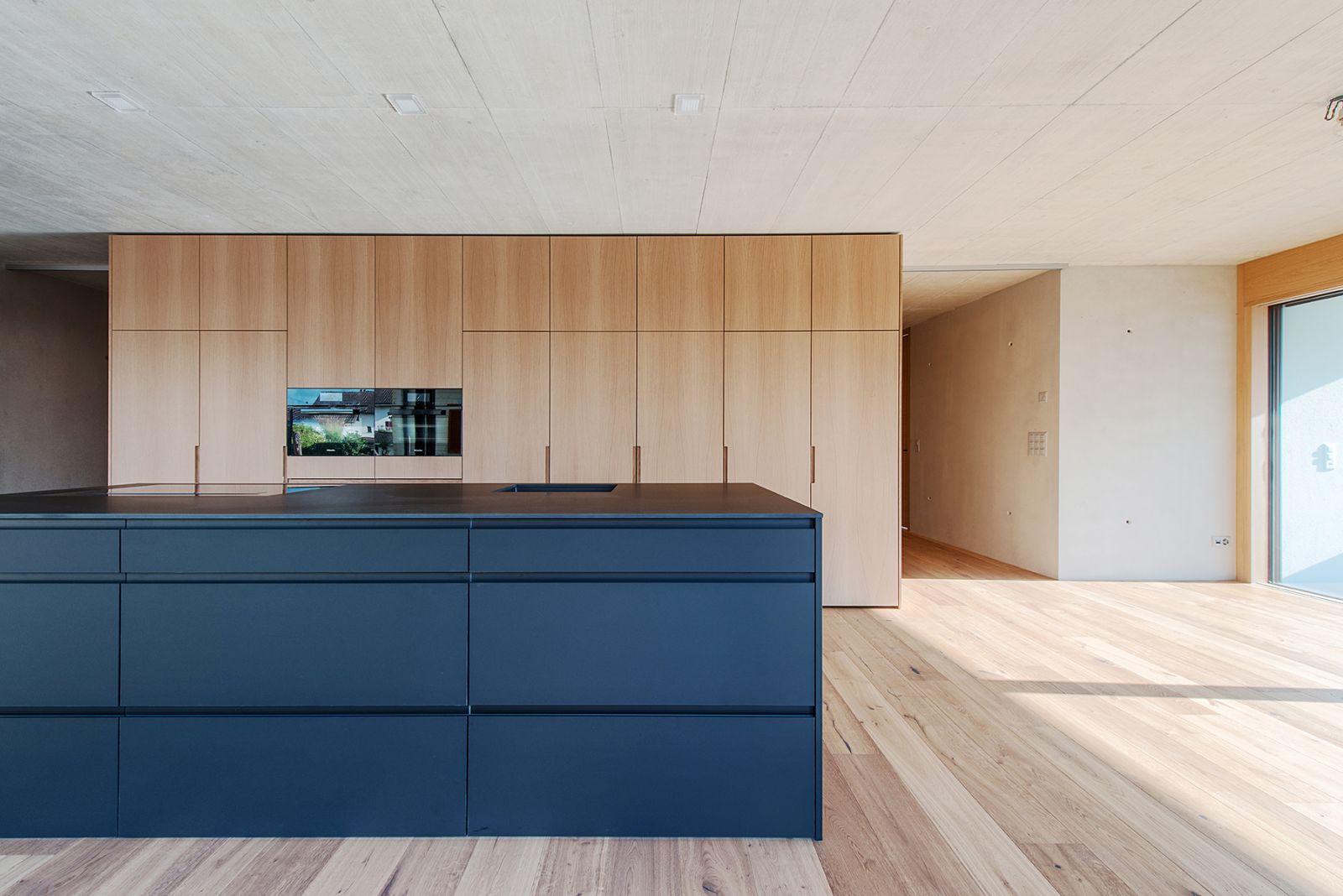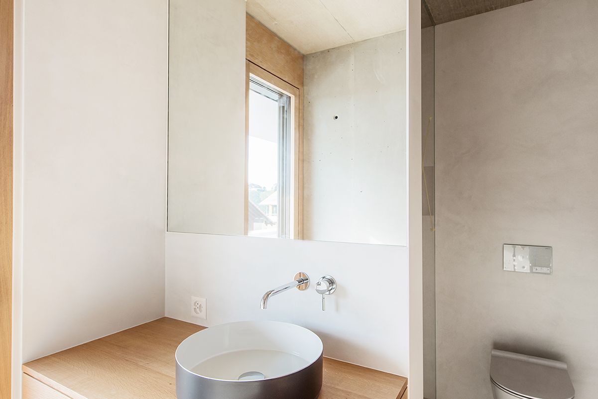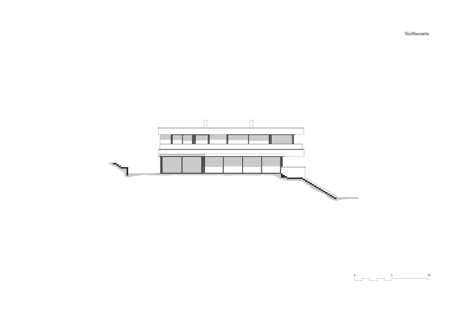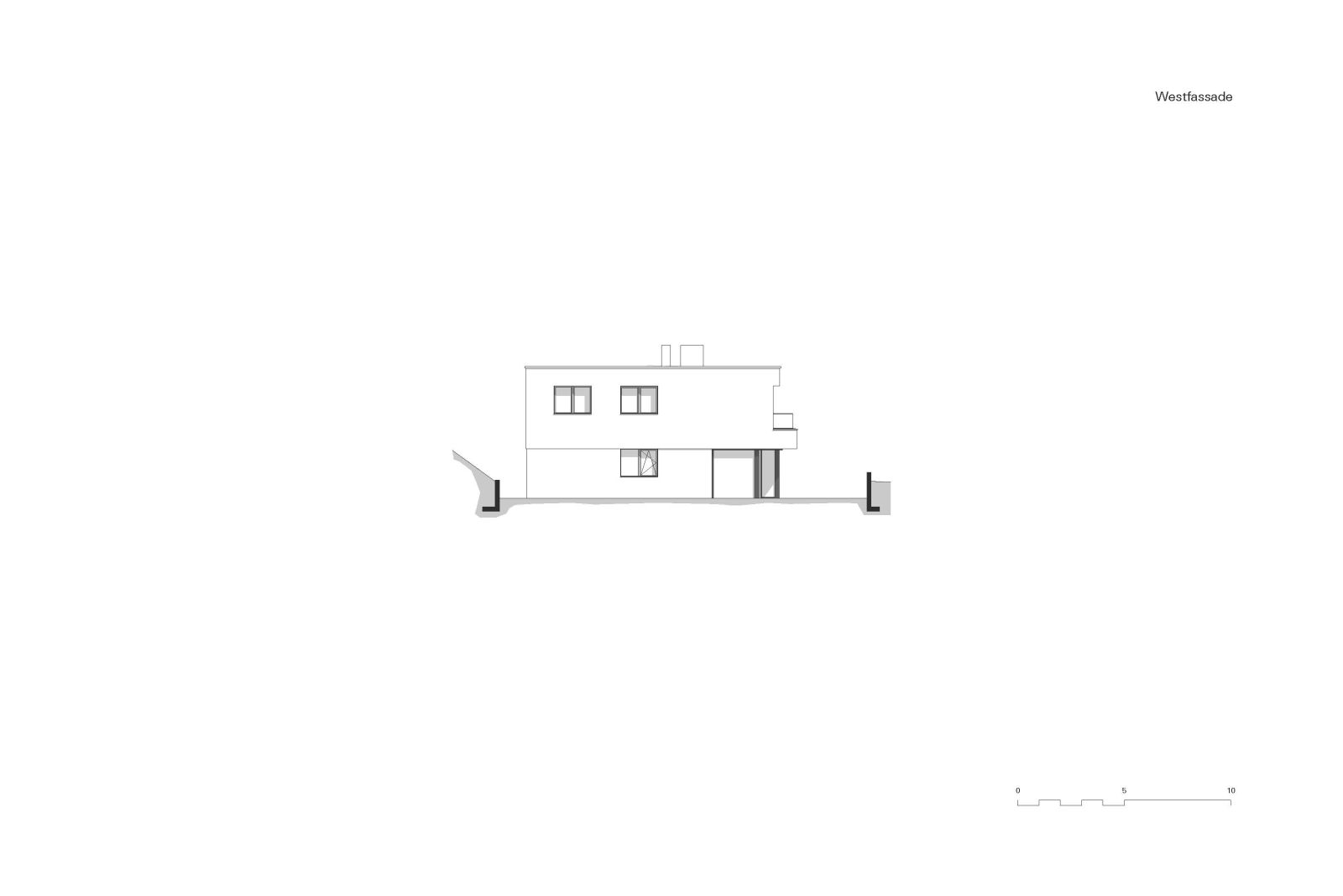 Zwei Geschosswohnungen mit jeweils circa 160 Quadratmeter waren die Grundanforderungen für dieses Mehrfamilienhaus. Aus den Grundstückslinien heraus ergibt sich eine Gebäudeform, die sich wie zwei Spangen auseinander biegt und in deren Mitte ein Kern steht, der komplett umrundet werden kann. Dadurch wird der Innenraum aufgebrochen und es bilden sich spezielle Raumabfolgen. Durch die Hanglage kann das Gebäude ebenerdig im Untergeschoss mit einer Tiefgarage erschlossen werden. Ein Treppenhaus erschliesst beide Geschosswohnungen.