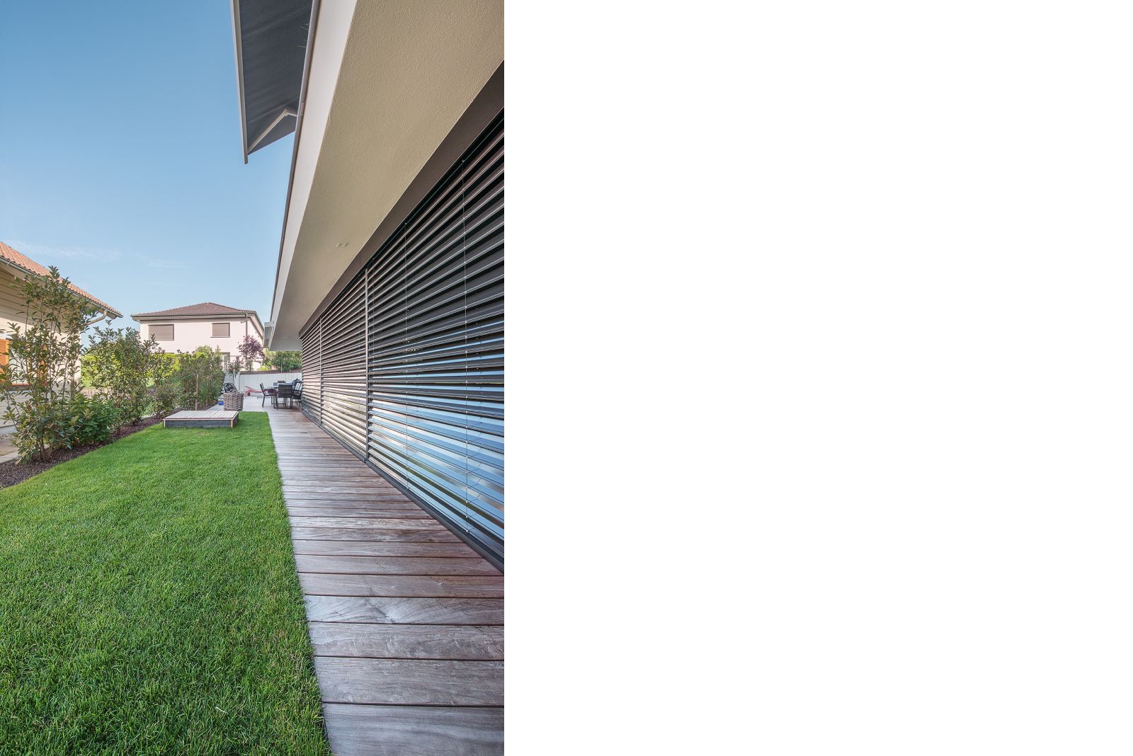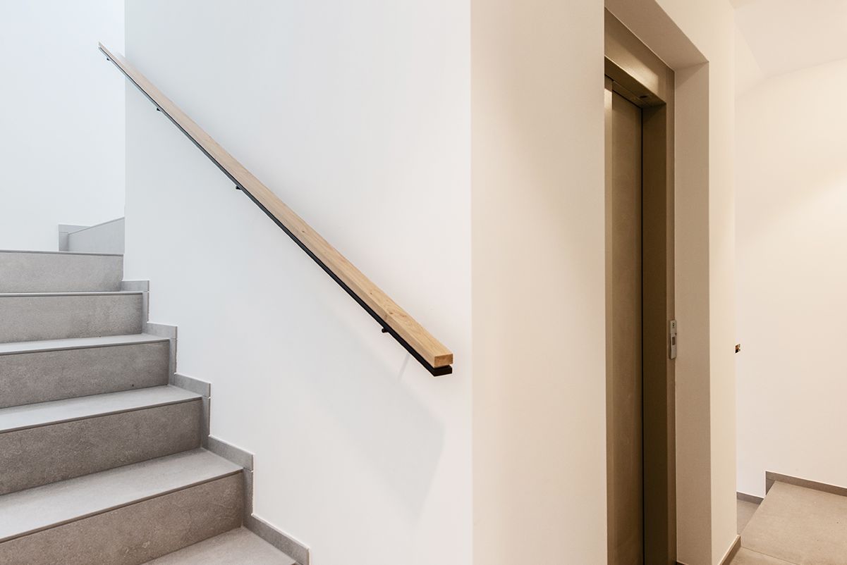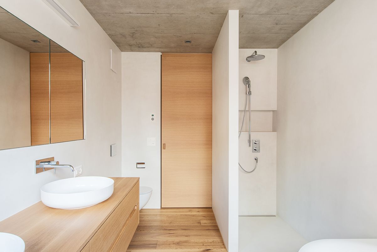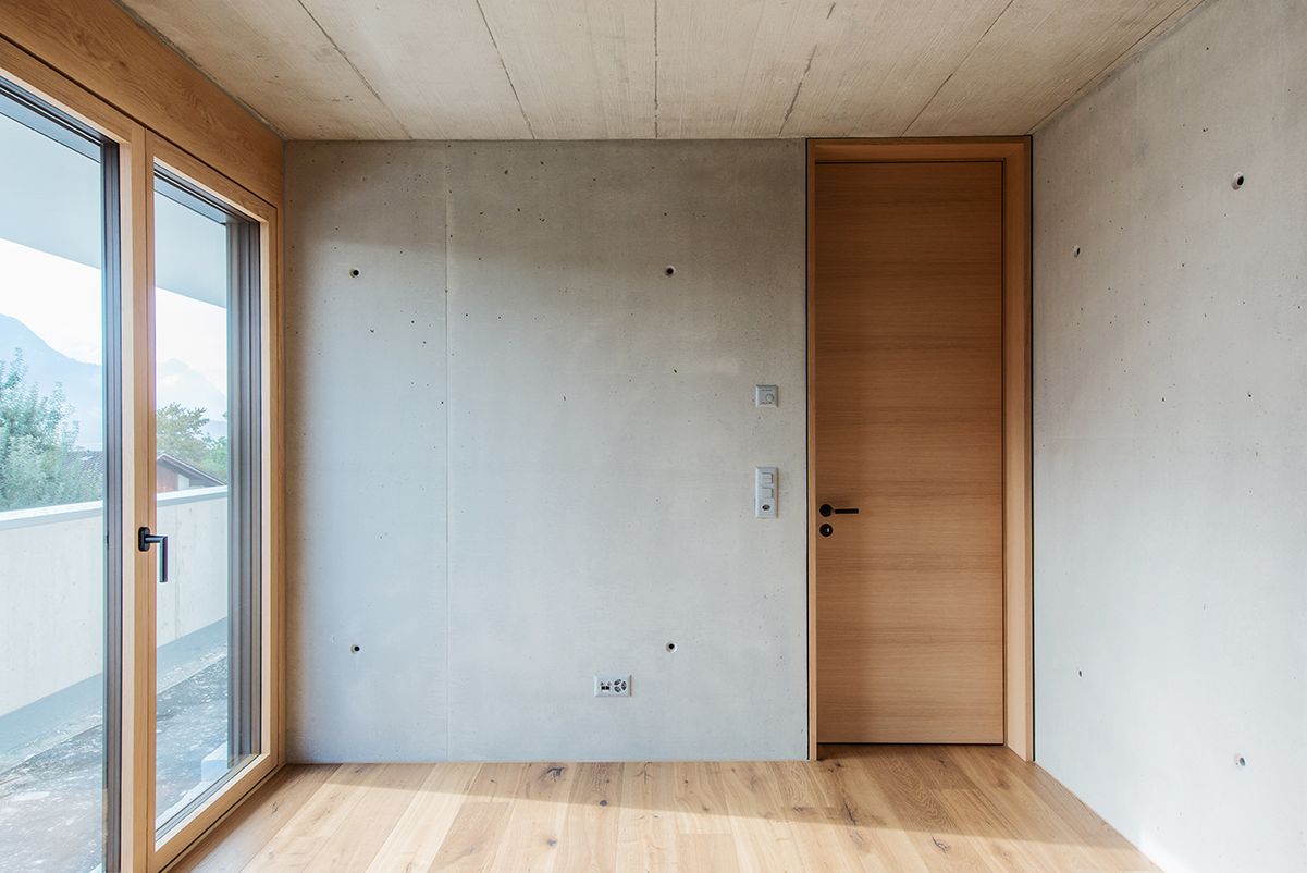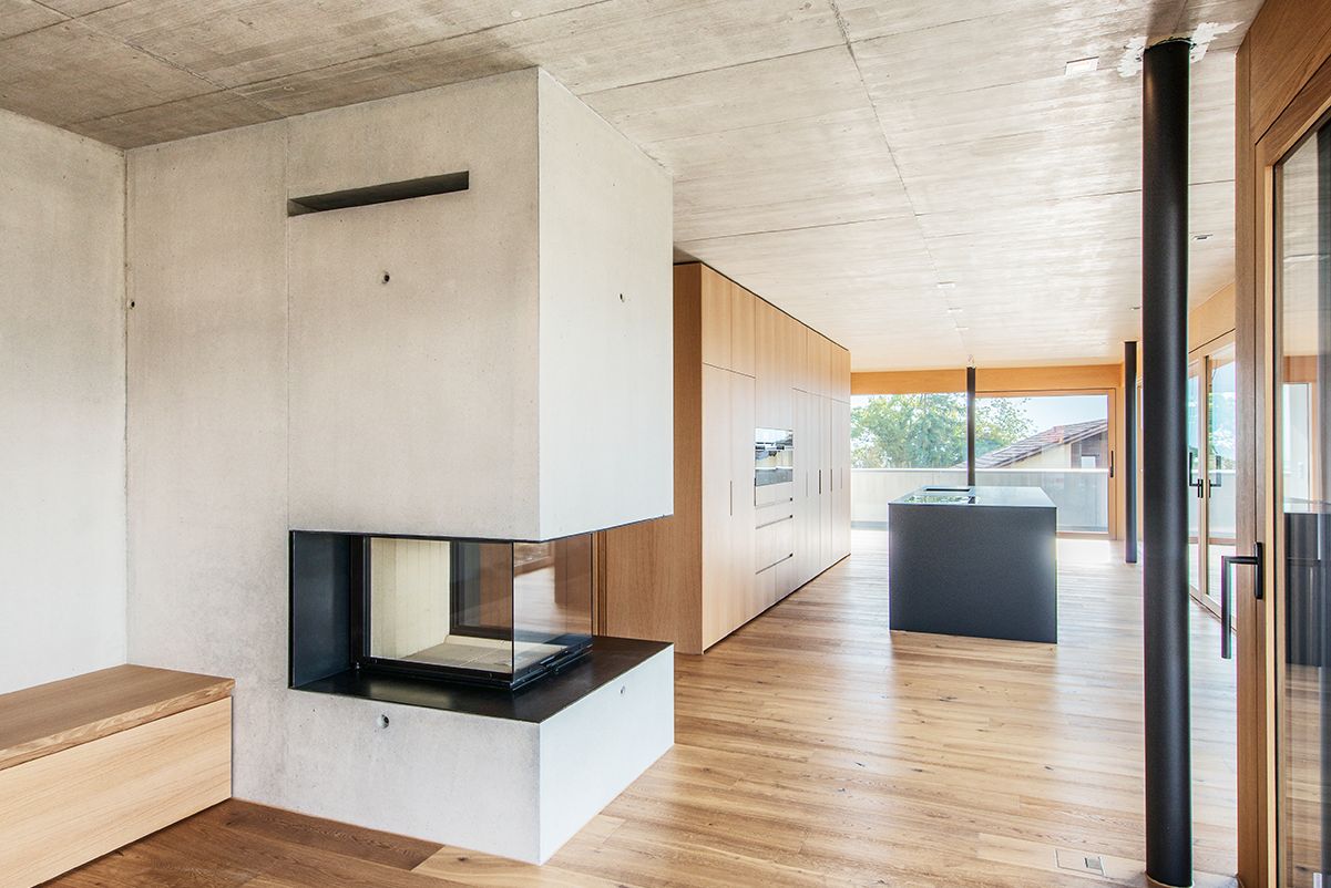 Zwei Geschosswohnungen mit jeweils circa 160 Quadratmeter waren die Grundanforderungen für dieses Mehrfamilienhaus. Aus den Grundstückslinien heraus ergibt sich eine Gebäudeform, die sich wie zwei Spangen auseinander biegt und in deren Mitte ein Kern steht, der komplett umrundet werden kann. Dadurch wird der Innenraum aufgebrochen und es bilden sich spezielle Raumabfolgen. Durch die Hanglage kann das Gebäude ebenerdig im Untergeschoss mit einer Tiefgarage erschlossen werden. Ein Treppenhaus erschliesst beide Geschosswohnungen.