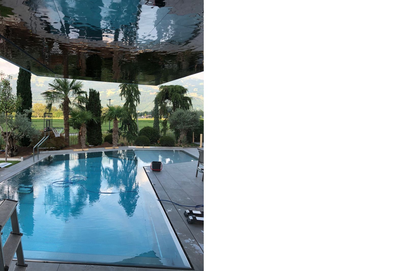 Die spezielle Architektursprache des Neubaus wiederholt sich sowohl im Grundriss als auch in den Formen von Dach und Pool. Mit seiner grossen Auskragung überspannt das Dach vom Innenraum her einen grossen Teil des Wassers und schafft so unterschiedliche Qualitäten für die Benutzung des Pools. Das Wasser spiegelt sich durch die Materialwahl des Daches und unterstreicht damit dessen Einzigartigkeit. Die feinen Skyframe Rähmen der Fenster schaffen einen beinahe natlosen Übergang zum Aussenraum.