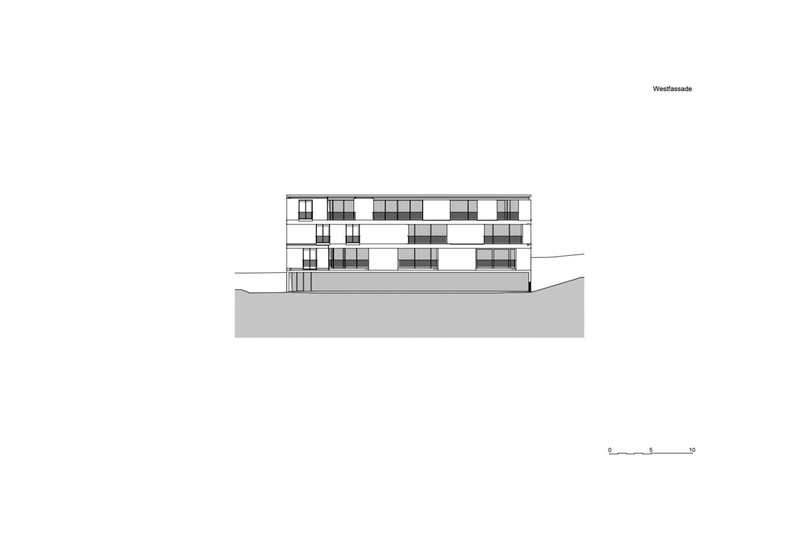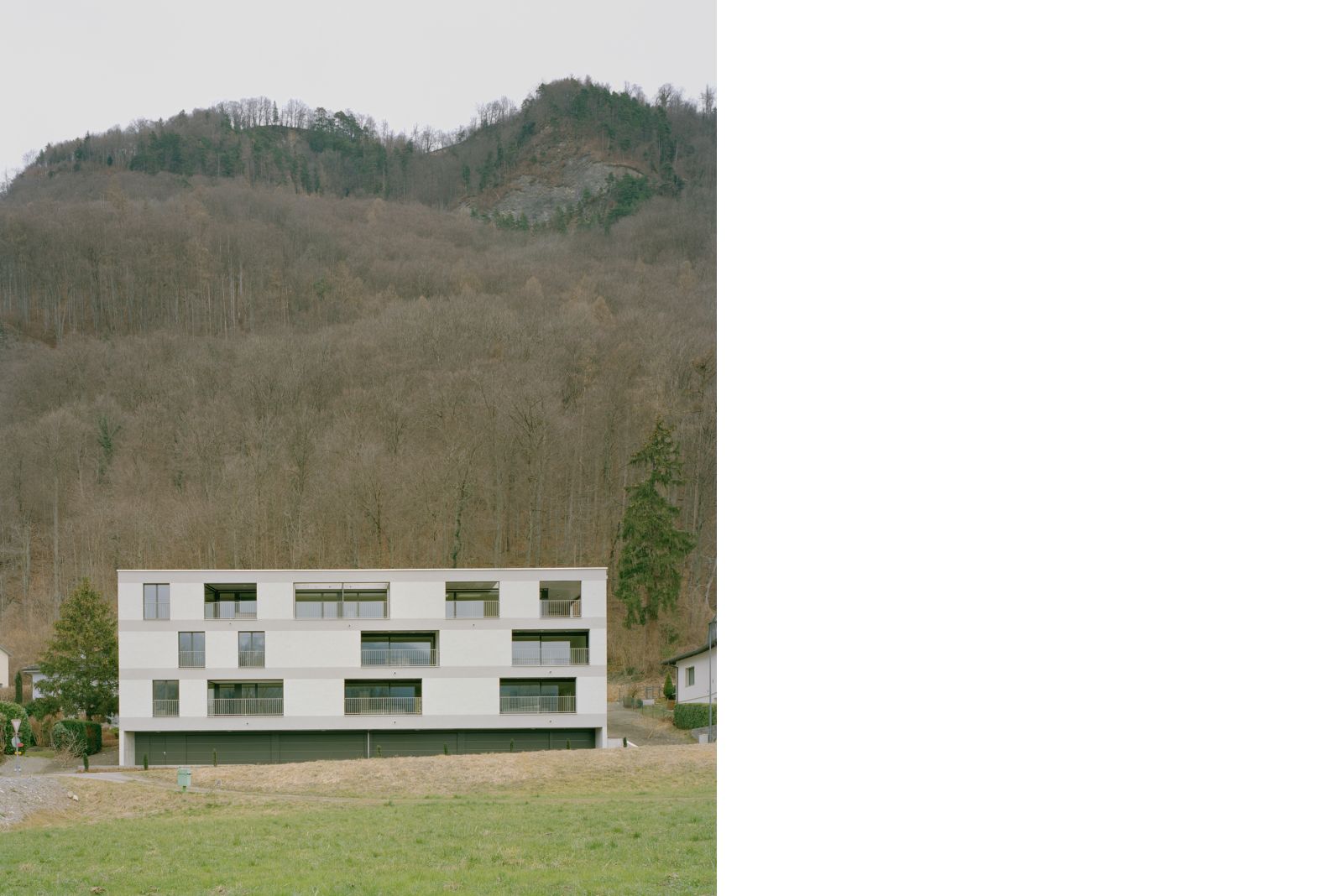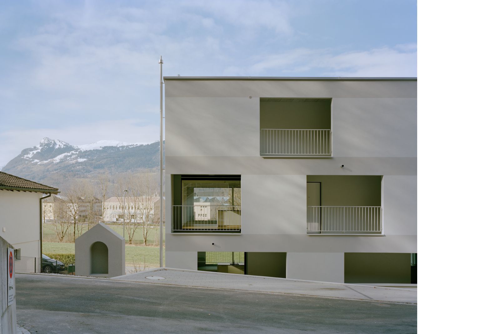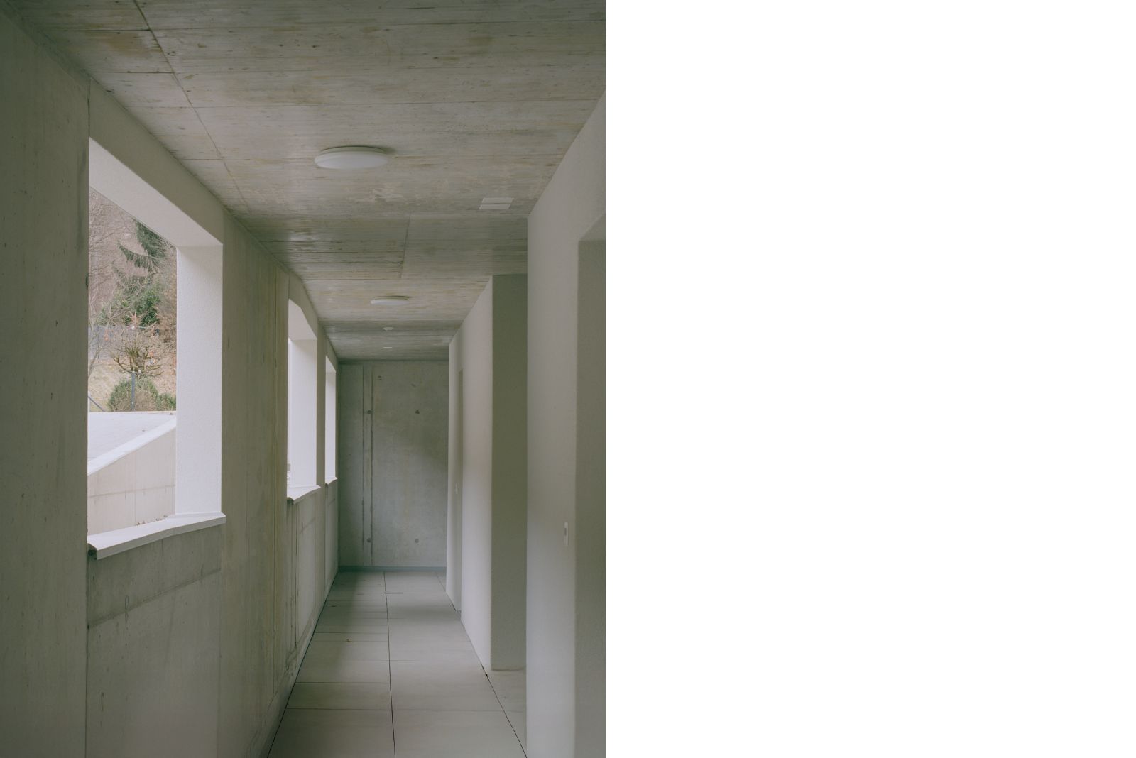Das Gebäude zeigt sich zum Buchenweg hin als dreigeschossiger Baukörper. Die Erschliessung mit dem Auto erfolgt über die Meierhofstrasse. Der grosszügige Vorplatz der Einstellhalle bietet den Fahrzeugen genügend Platz zum Rangieren und dient zugleich als zusätzliche Parkierungsfläche. Der Baukörper wird durch den geschützen Vorbereich zusätzlich von der stark frequenzierten Meierhofstrasse abgegrenzt. Die verkehrsberuhigte Lage am Buchenweg – welcher in einer Sackgasse endet – wird als Hauptzugang für Besucher und Fussgänger genutzt. Der nach Ost/West orientierte Baukörper fasst insgesamt sieben Wohnungen auf drei Geschossen. Die Nebenräume im Untergeschoss werden zum Hang hin gesetzt. Ein offener Laubengang gegen Osten erschliesst die Wohnungen mit durch Sitzplätze nutzbaren Gangzonen.