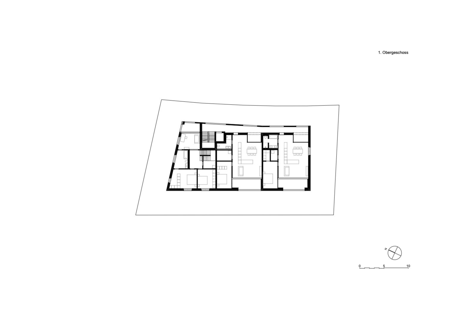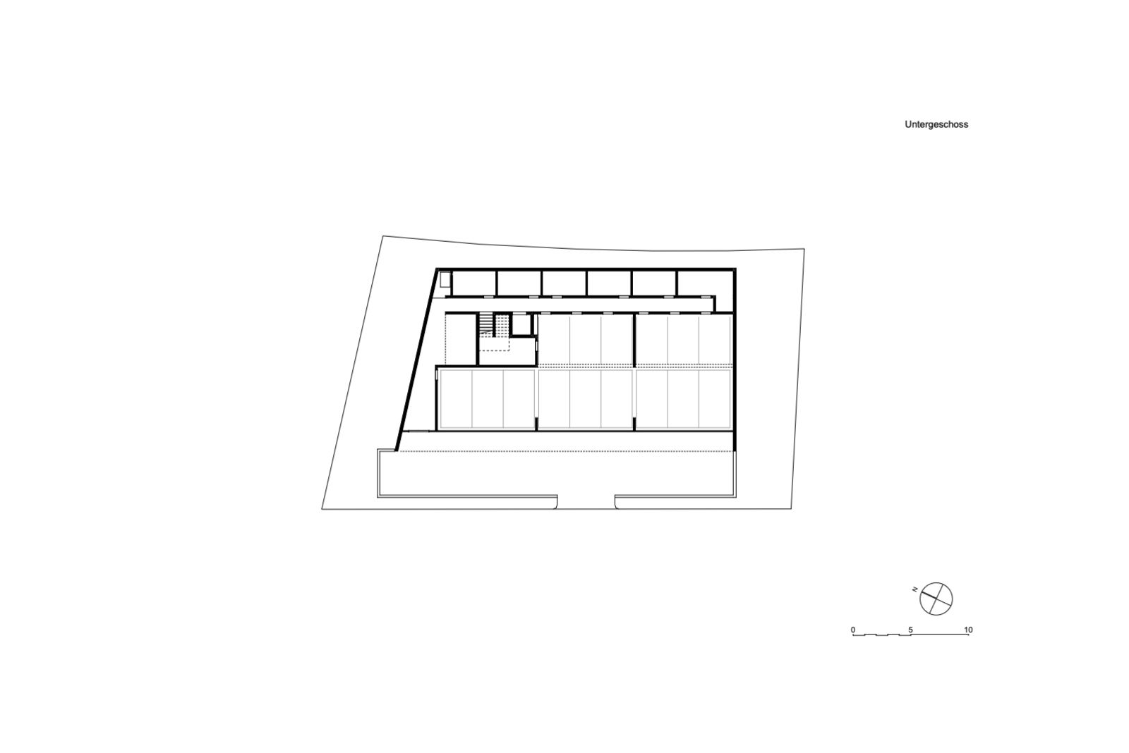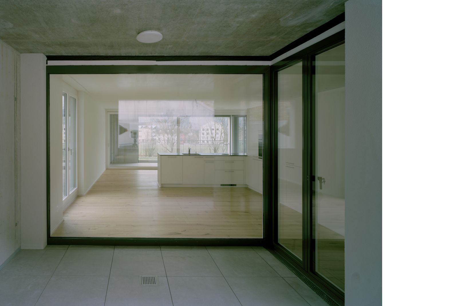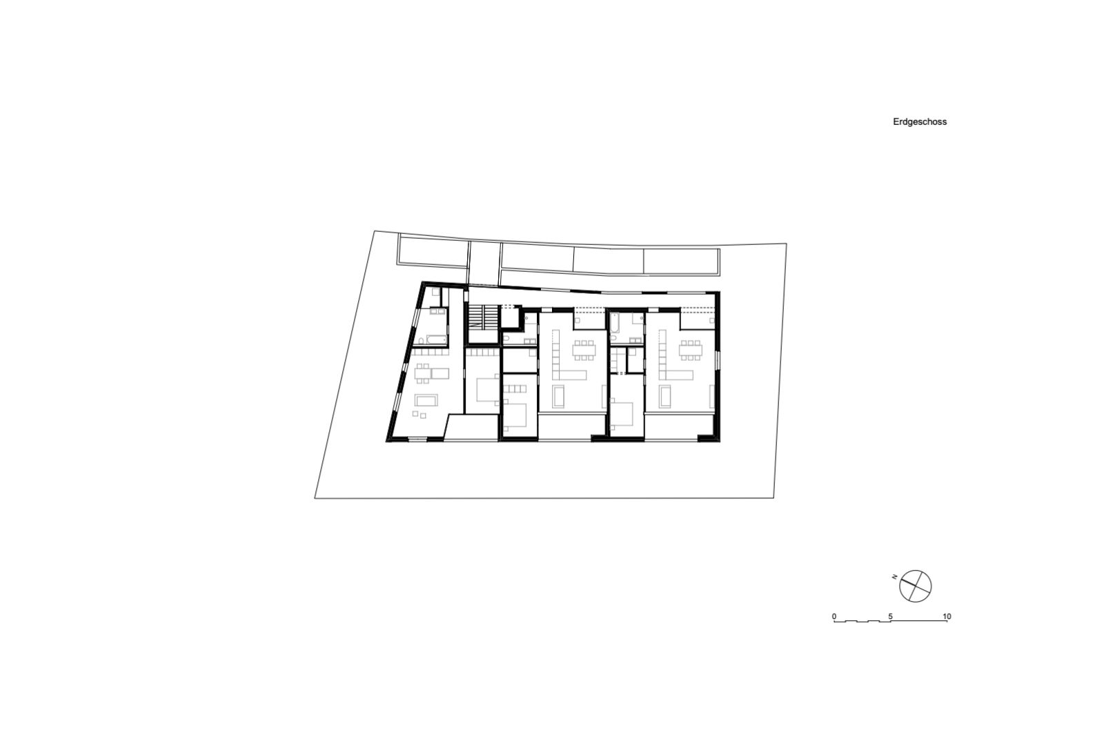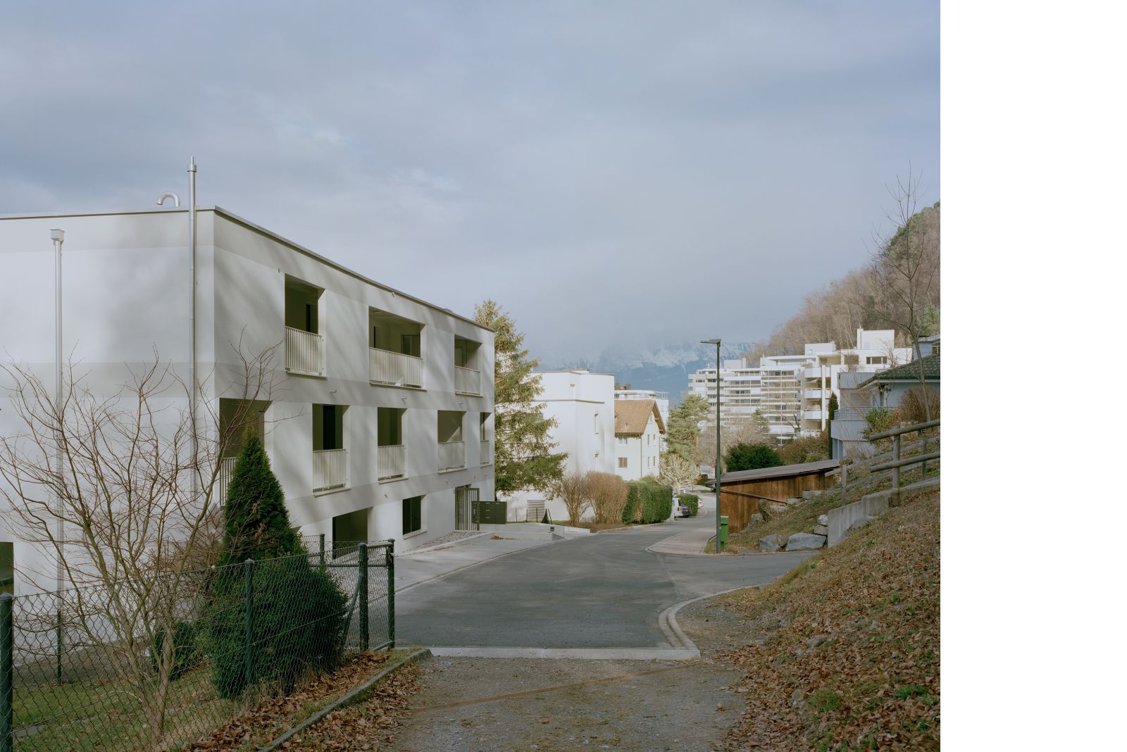 Das Gebäude zeigt sich zum Buchenweg hin als dreigeschossiger Baukörper. Die Erschliessung mit dem Auto erfolgt über die Meierhofstrasse. Der grosszügige Vorplatz der Einstellhalle bietet den Fahrzeugen genügend Platz zum Rangieren und dient zugleich als zusätzliche Parkierungsfläche. Der Baukörper wird durch den geschützen Vorbereich zusätzlich von der stark frequenzierten Meierhofstrasse abgegrenzt. Die verkehrsberuhigte Lage am Buchenweg – welcher in einer Sackgasse endet – wird als Hauptzugang für Besucher und Fussgänger genutzt. Der nach Ost/West orientierte Baukörper fasst insgesamt sieben Wohnungen auf drei Geschossen. Die Nebenräume im Untergeschoss werden zum Hang hin gesetzt. Ein offener Laubengang gegen Osten erschliesst die Wohnungen mit durch Sitzplätze nutzbaren Gangzonen.