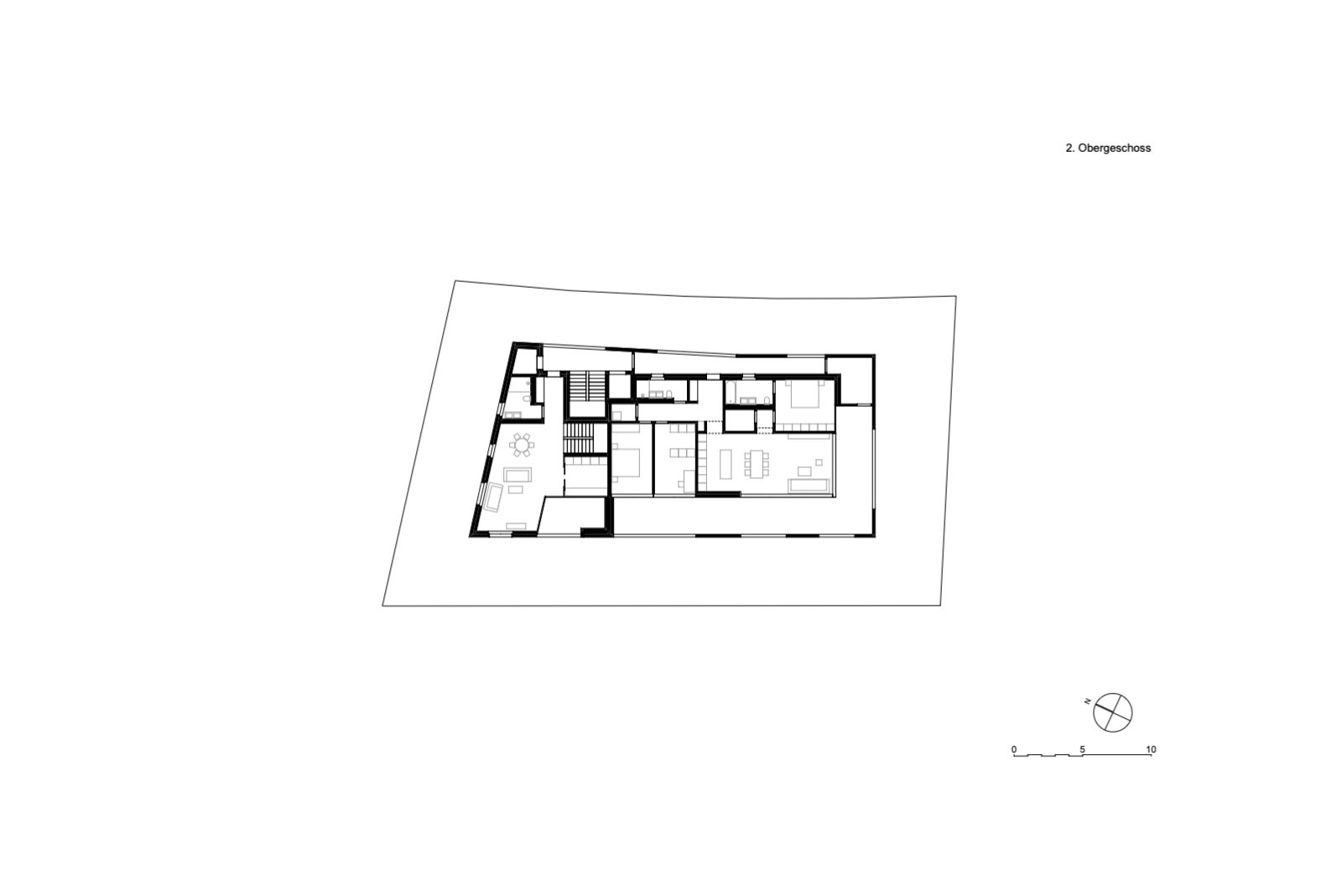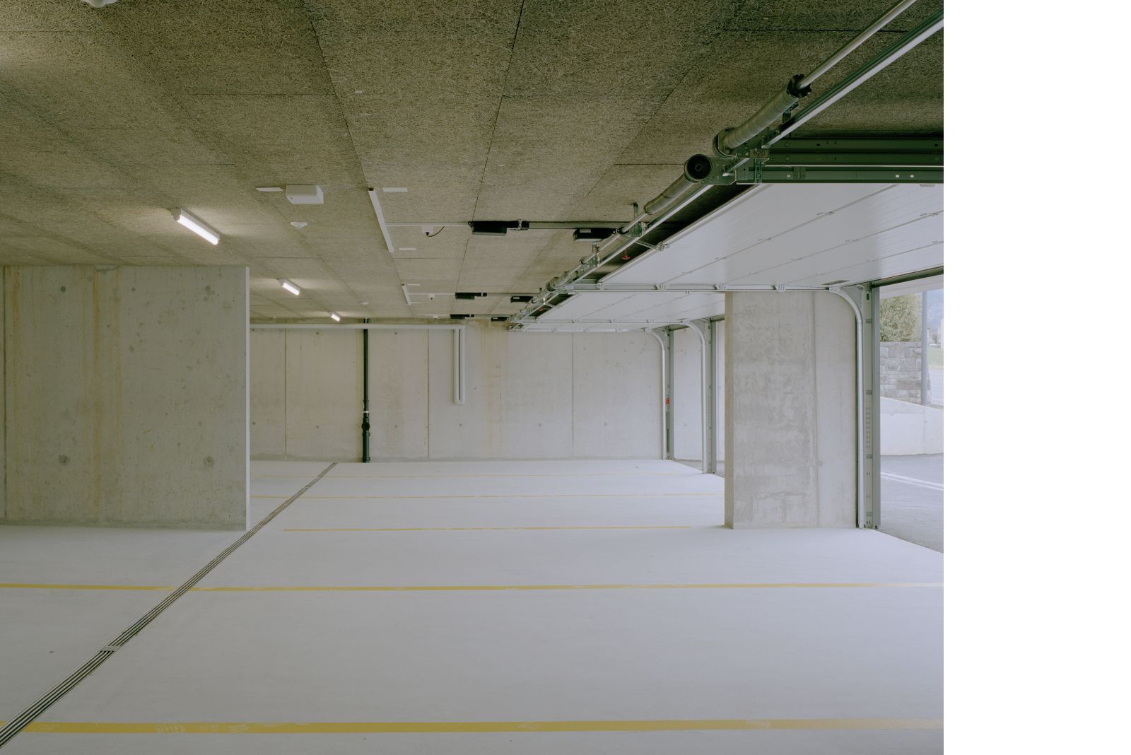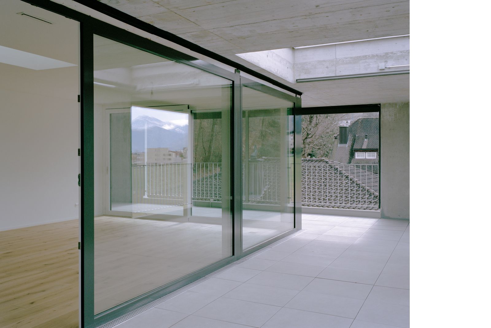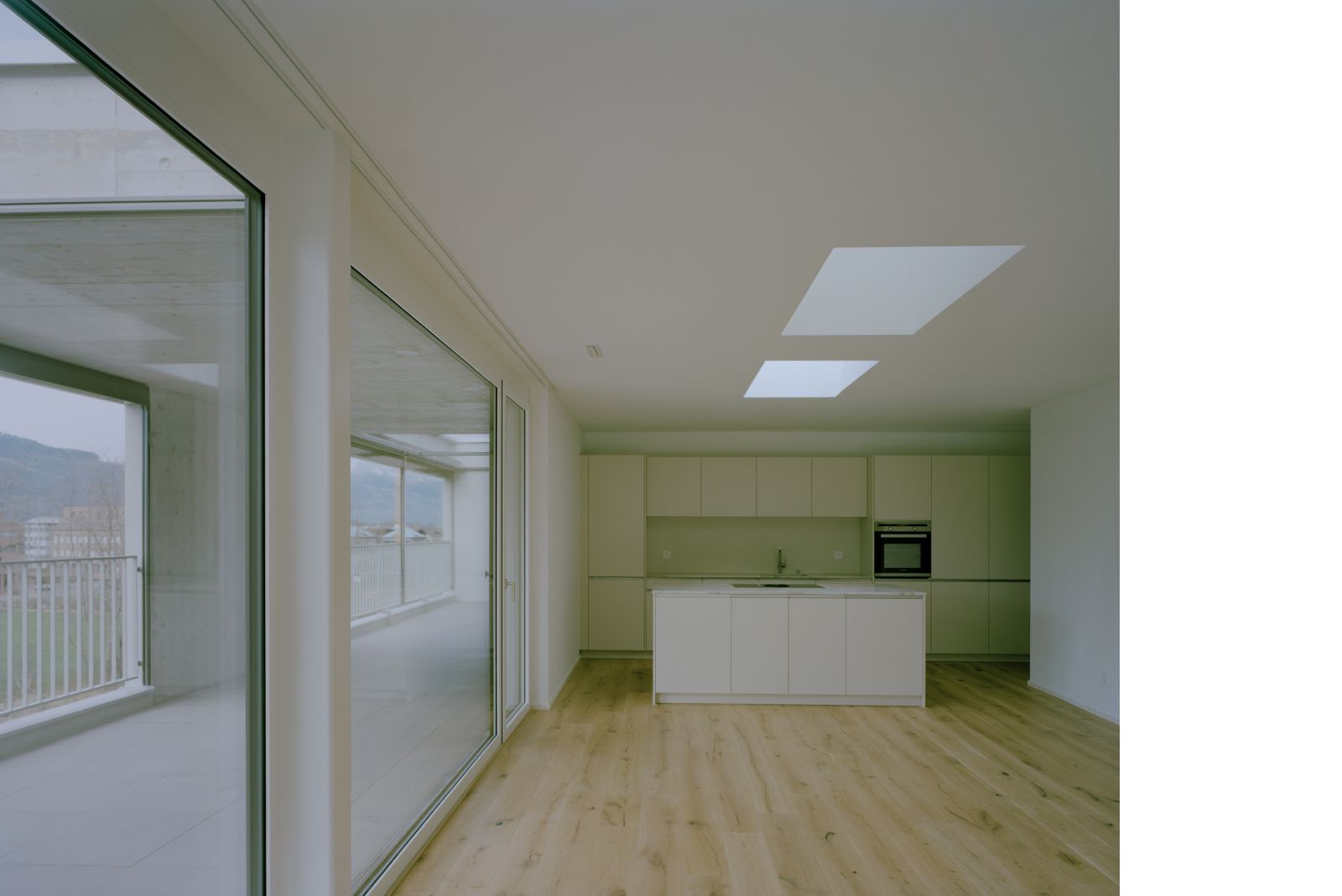 Das Gebäude zeigt sich zum Buchenweg hin als dreigeschossiger Baukörper. Die Erschliessung mit dem Auto erfolgt über die Meierhofstrasse. Der grosszügige Vorplatz der Einstellhalle bietet den Fahrzeugen genügend Platz zum Rangieren und dient zugleich als zusätzliche Parkierungsfläche. Der Baukörper wird durch den geschützen Vorbereich zusätzlich von der stark frequenzierten Meierhofstrasse abgegrenzt. Die verkehrsberuhigte Lage am Buchenweg – welcher in einer Sackgasse endet – wird als Hauptzugang für Besucher und Fussgänger genutzt. Der nach Ost/West orientierte Baukörper fasst insgesamt sieben Wohnungen auf drei Geschossen. Die Nebenräume im Untergeschoss werden zum Hang hin gesetzt. Ein offener Laubengang gegen Osten erschliesst die Wohnungen mit durch Sitzplätze nutzbaren Gangzonen.