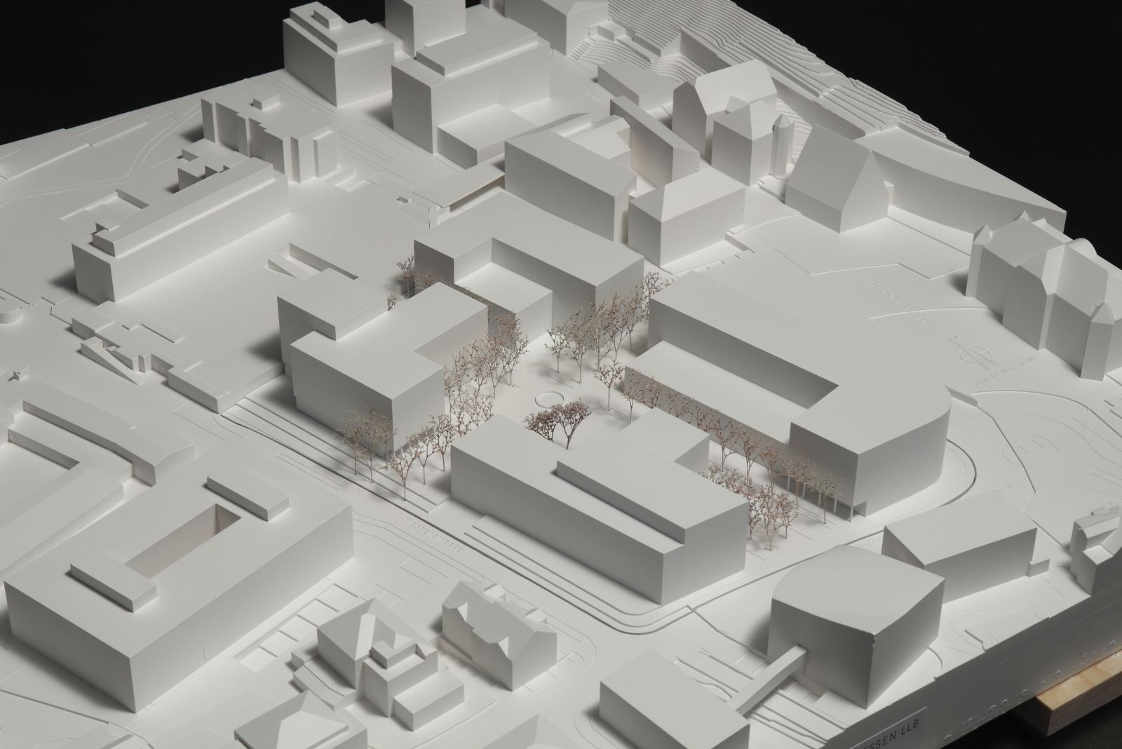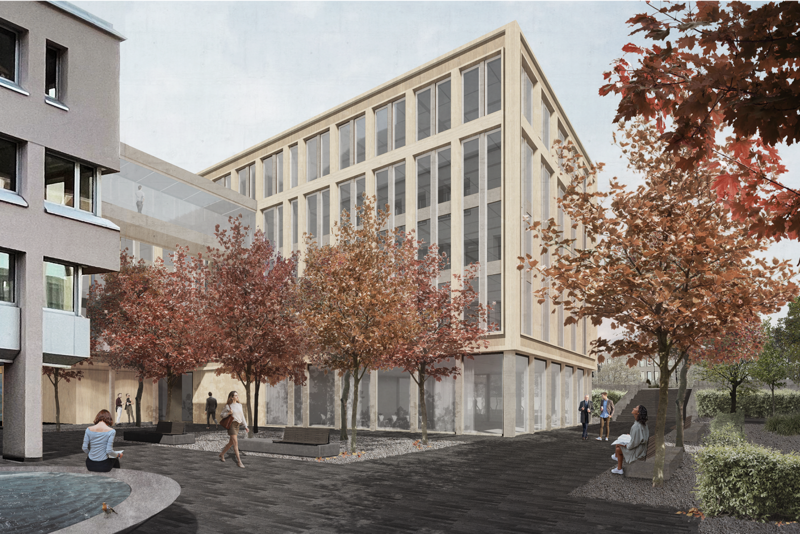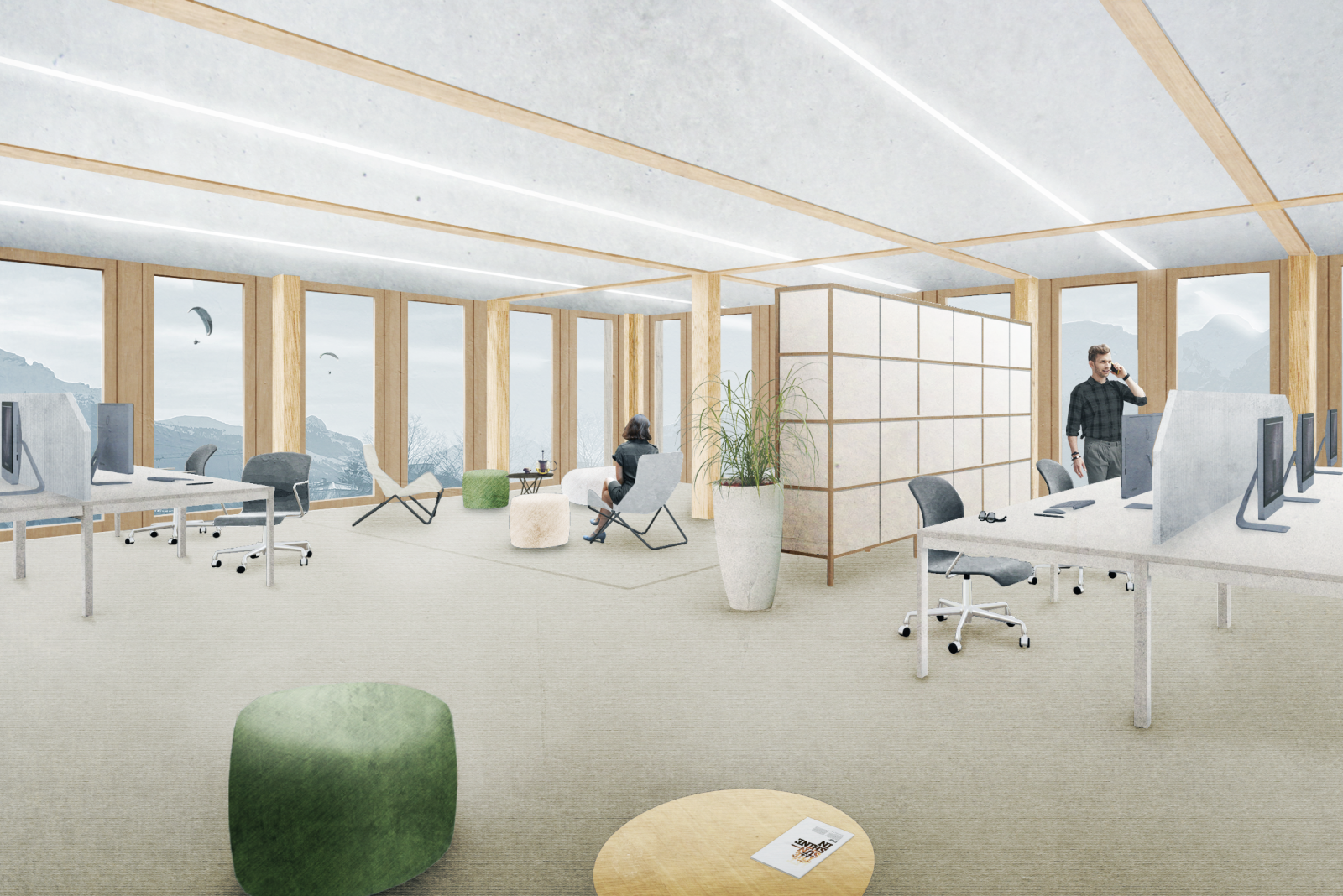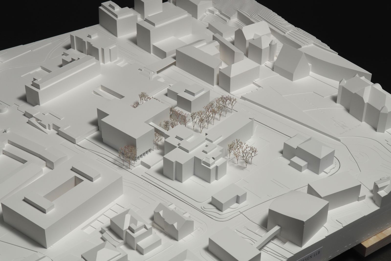 Eine wesentliche Rolle des Projektentwurfs spielen sowohl die bestehenden Strukturen der Einstellhalle sowie die Gebäudestrukturen der Bestandesbauten. Der Neubau Giessen reagiert auf die statischen Grundlagen indem er die klare Gebäudestruktur als Ergänzung der bestehenden Strukturen setzt. Wände, Stützen und tragende Elemente werden in den oberen Geschossen übernommen. Die nicht zu bebauenden Bereiche werden freigelassen und die freien Zonen werden stärker belastet indem sie beispielsweise den massiven Erschliessungskern beherbergen. Die Einstellhalle wird mit wenigen Eingriffen klarer strukturiert und schafft dadurch Platz für die Räume des Neubaus. Das Erdgeschoss setzt die allgemeinen und öffentlichen Bereiche in den Mittelpunkt. Das Foyer setzt sich als grosszügiger Rundlauf um einen zonierenden Kern. Die privater gelegenen Nebenräume der Mitarbeiter befinden sich geschützt im hinteren Bereich. Das Erdgeschoss wird als transparente Hülle ausgebildet und zeigt sich gegen aussen lediglich als Glas und Tragstruktur.