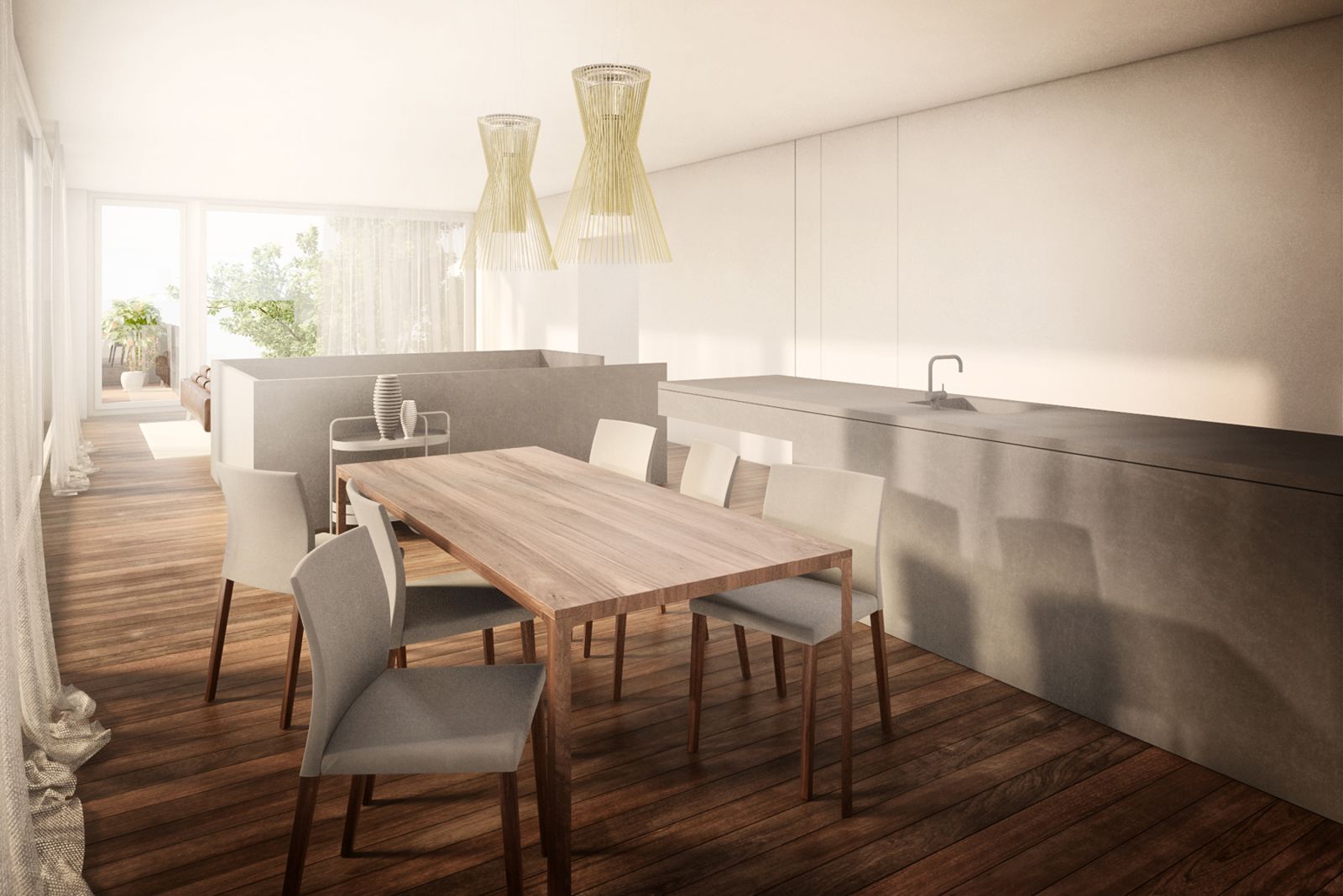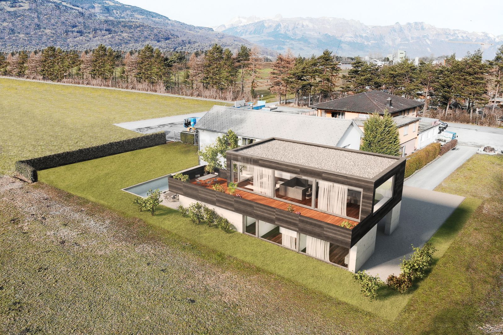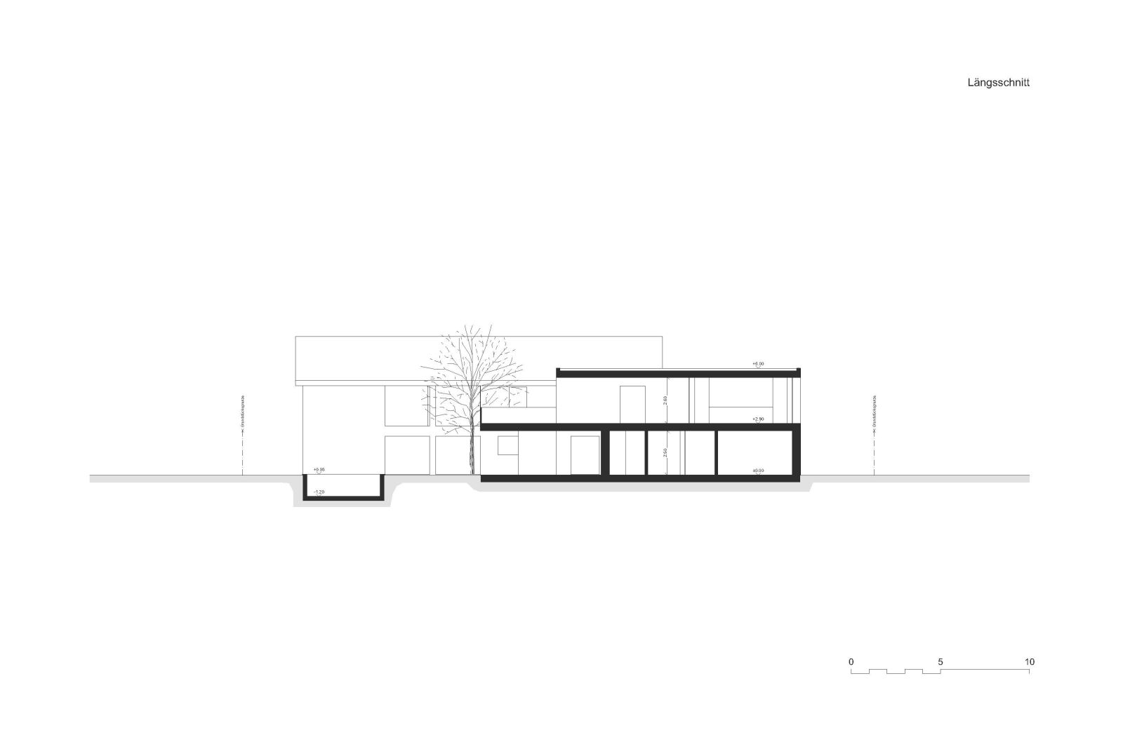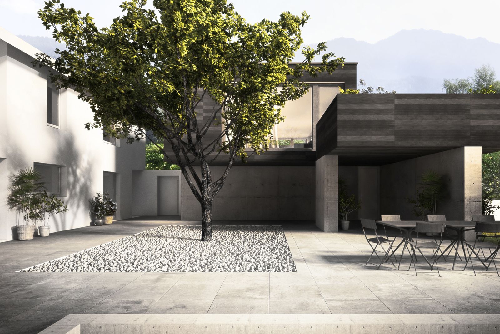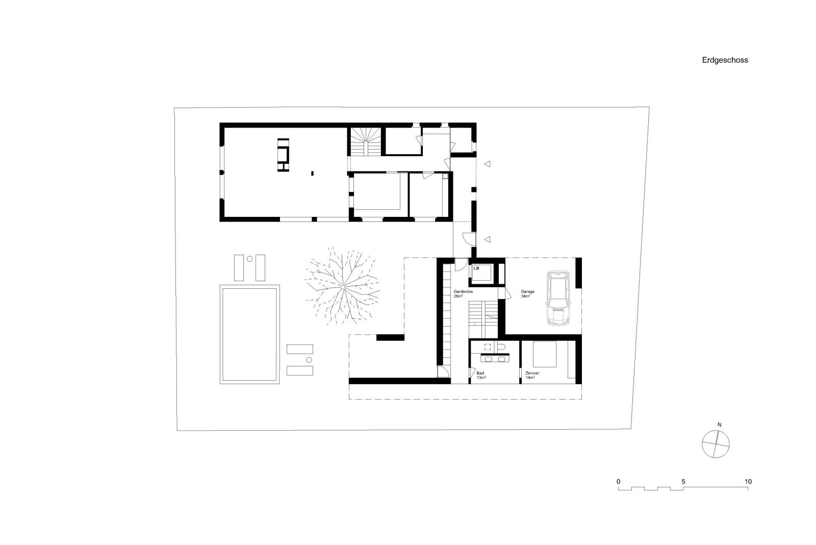 Das schlichte, gut proportionierte Wohnhaus mit der, durch einen Laubengang verbundenen, Garage bildet Aussenräume mit unterschiedlichen Qualitäten. Das Projekt am Standort der ursprünglichen Garage nutzt diese Grundlage und wertet die Nutzungen noch einmal auf. Die beiden Wohneinheiten von Bestand und Neubau werden durch den Laubengang sowohl verbunden als auch getrennt.