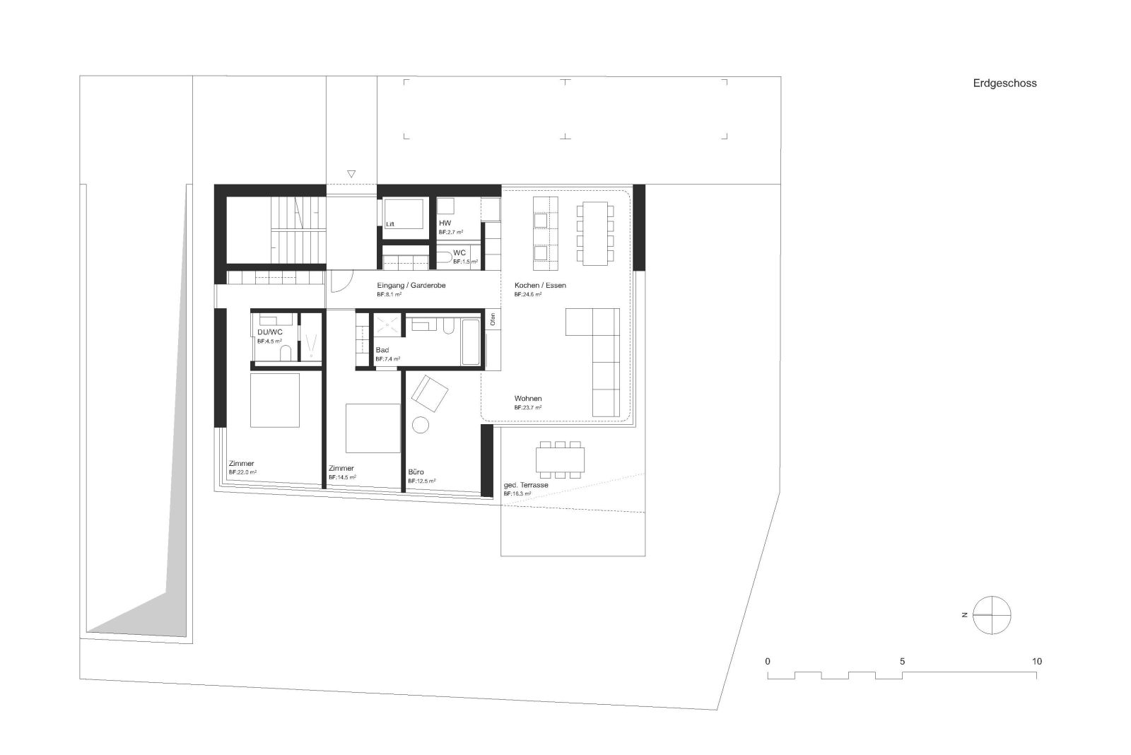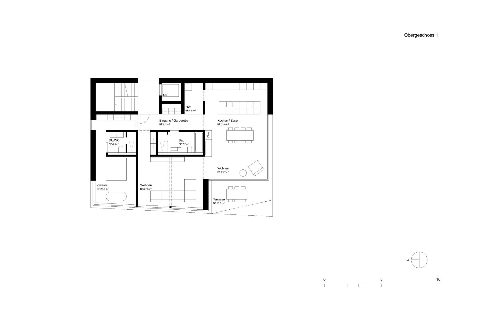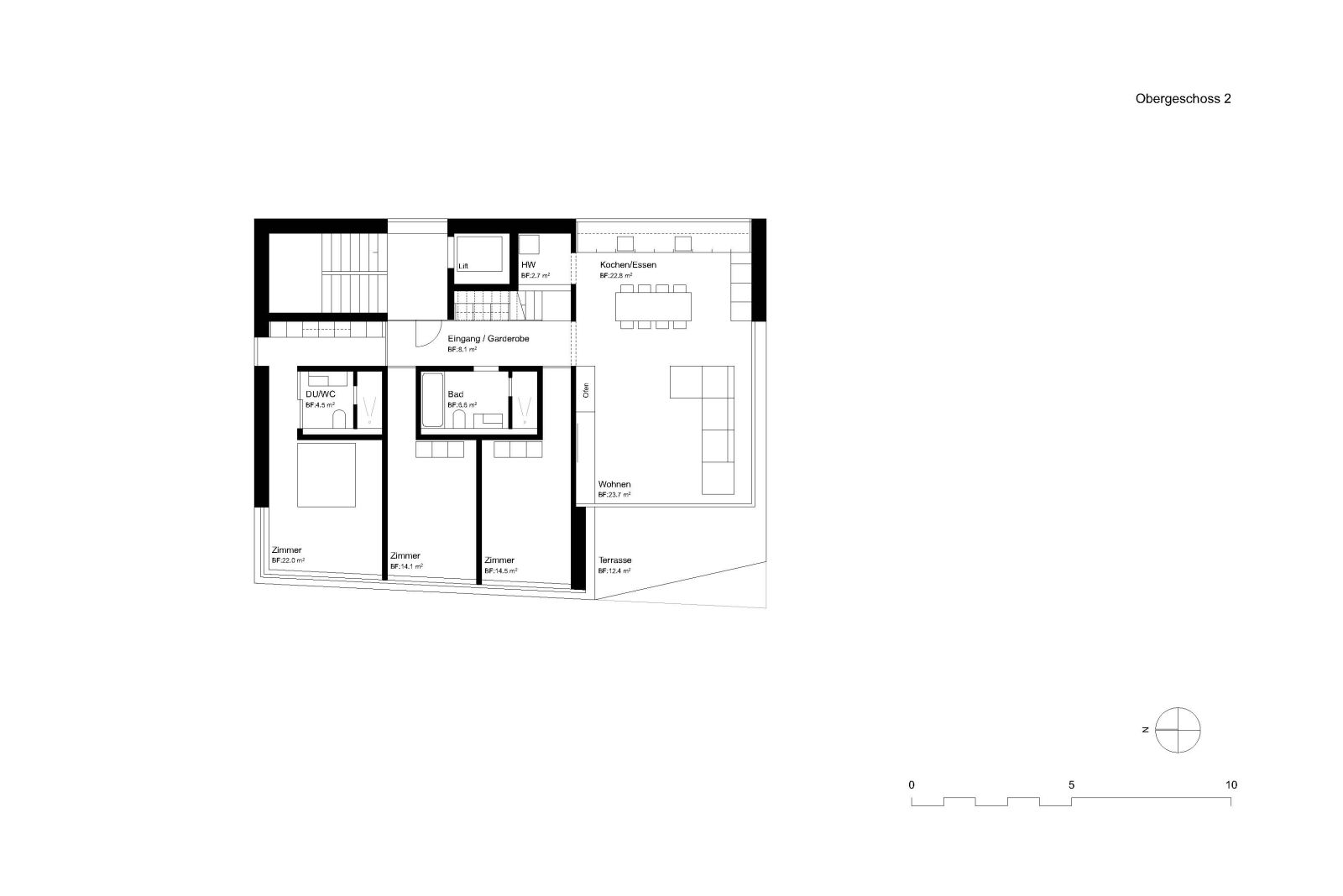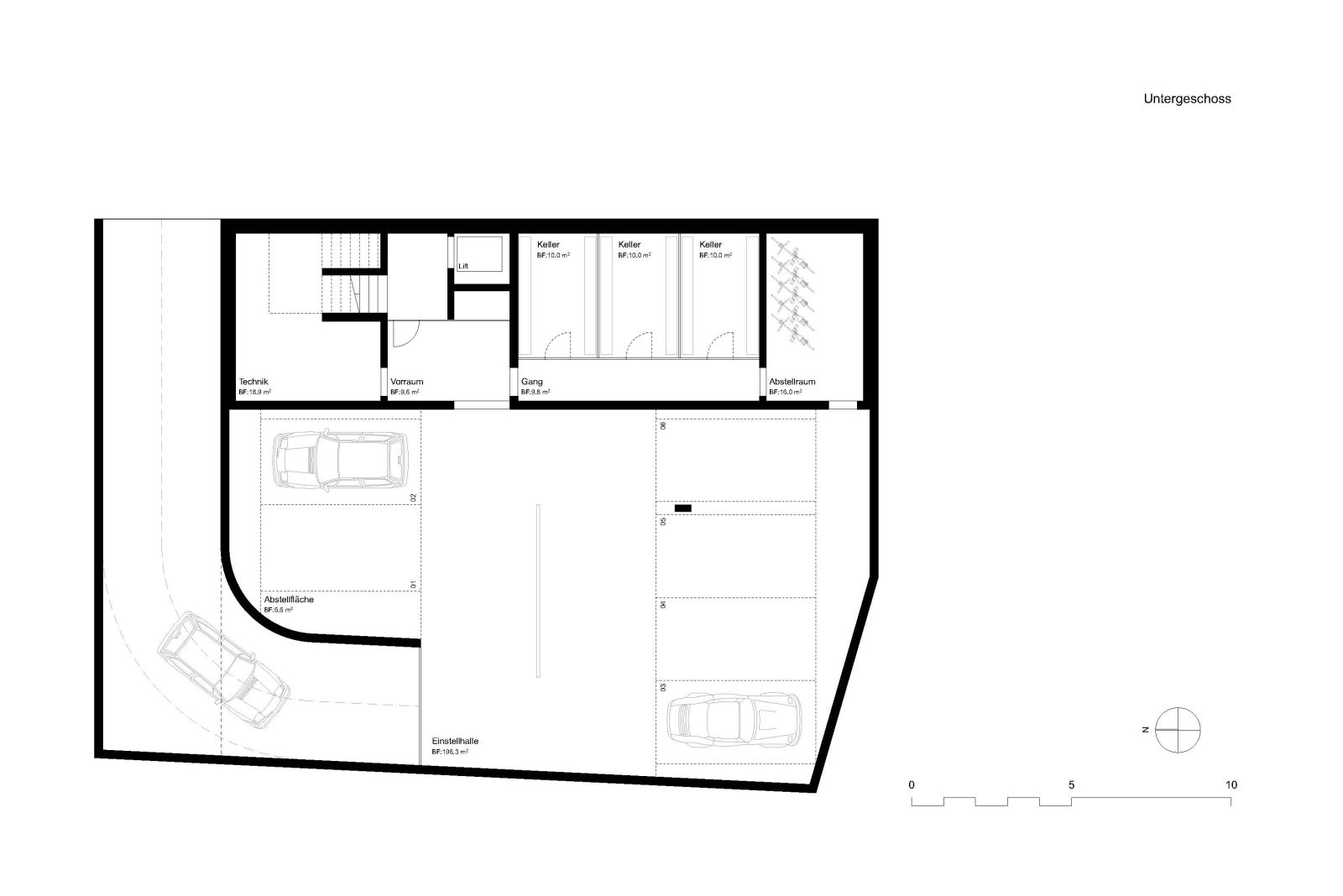 Das Wohnhaus mit drei Geschosswohnungen und Einstellhalle nutzt die Parzellengrenze optimal aus. Die Wohnungen orientieren sich nach Süd-West und öffnen sich zum Garten hin. Eine einfache Grundstruktur lässt, passend zu den Lebensabschnitten der Bewohner, unterschiedliche Ausbauvarianten der einzelnen Wohnungen zu. Hohe Flexibilität und sowie grosszügige und doch kompakte Grundrisse zeichnen das Projekt aus.