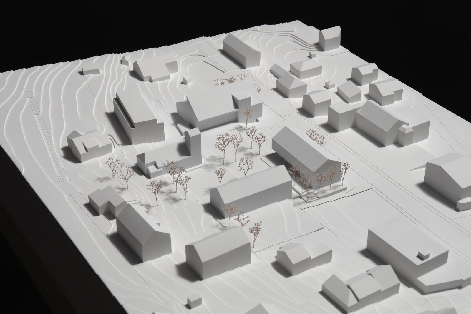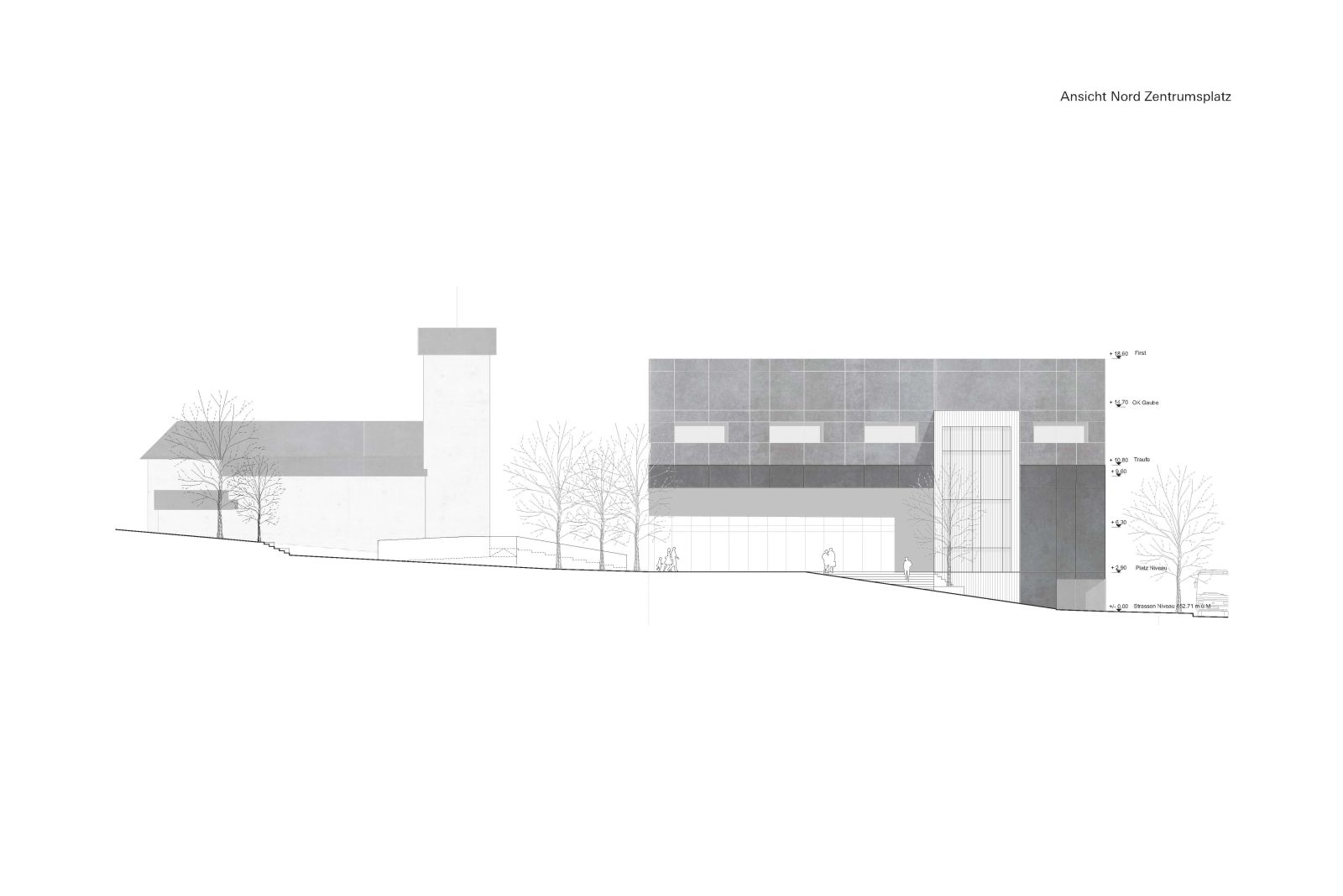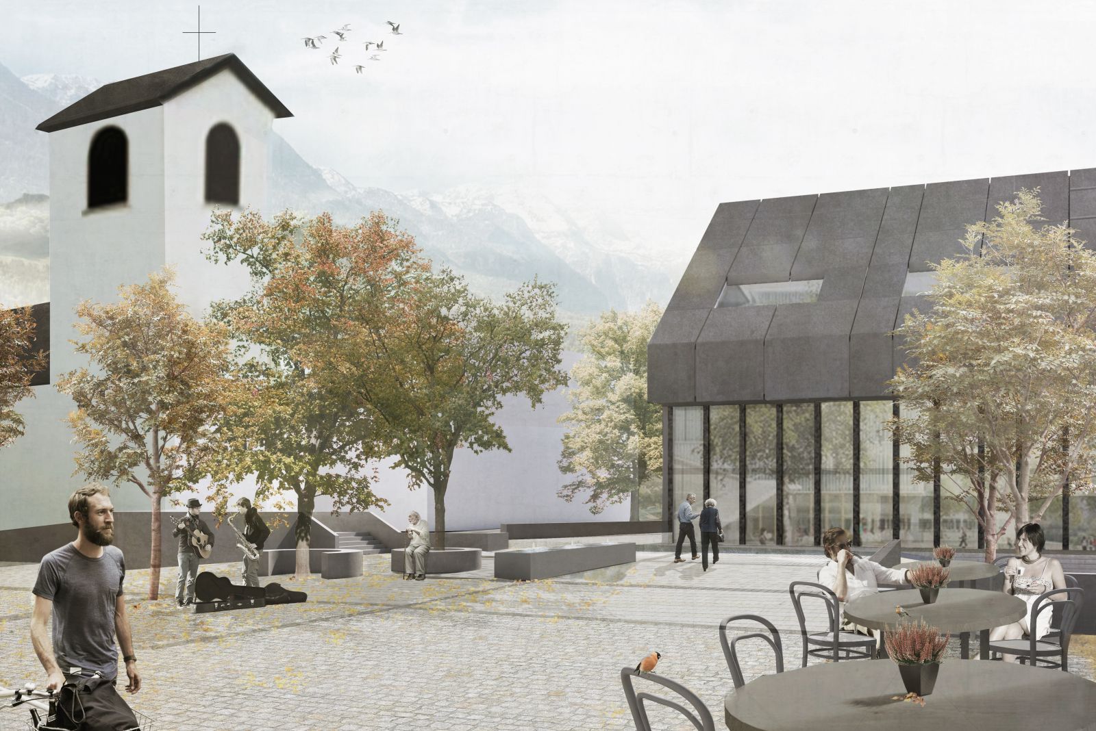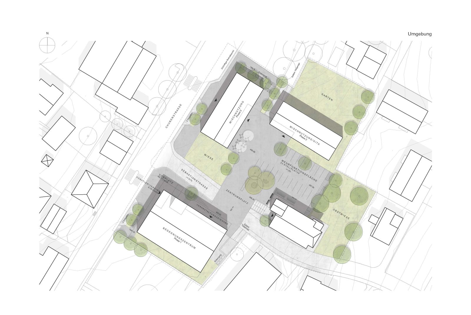 Die Raumkanten erzeugen eine spannungsvolle Entwicklung des Strassenraums und stellen die St. Sebastians Kirche frei. Die Kirche wird durch die neue Bebauung eingerahmt und bleibt das Herz der Siedlung. Durch Dachform und Materialität integriert sich das Projekt wie selbstverständlich in die bestehende Dorfstruktur. Das Zusammenbinden des die Kirche umspielenden Zentrumsplatzes mit Mehrfunktionsfläche und dem Platzbereich Begegenungszentrum gibt dem Dorf eine neue, grosszügige Mitte. Mit einem Höhenausgleich in der Sebastianstrasse gelingt es, diese beiden Platzseiten auch räumlich zu verknüpfen, was mit dem durchlaufenden Belagsmuster zusätzlich unterstützt wird. Um diese Abflachung im Übergangsbereich zu ermöglichen, wird die Steigung der Sebastianstrasse zwischen Einlenker Churerstrasse und Platzübergang etwas angepasst.