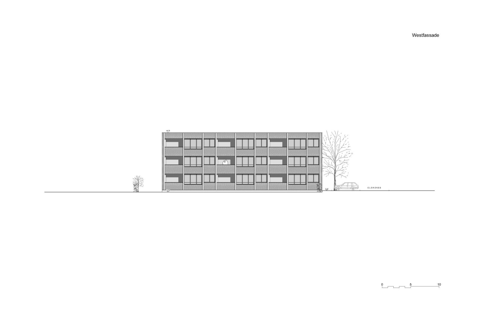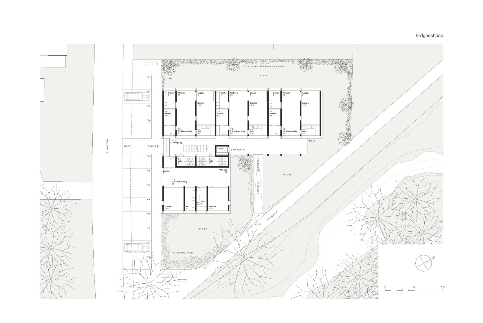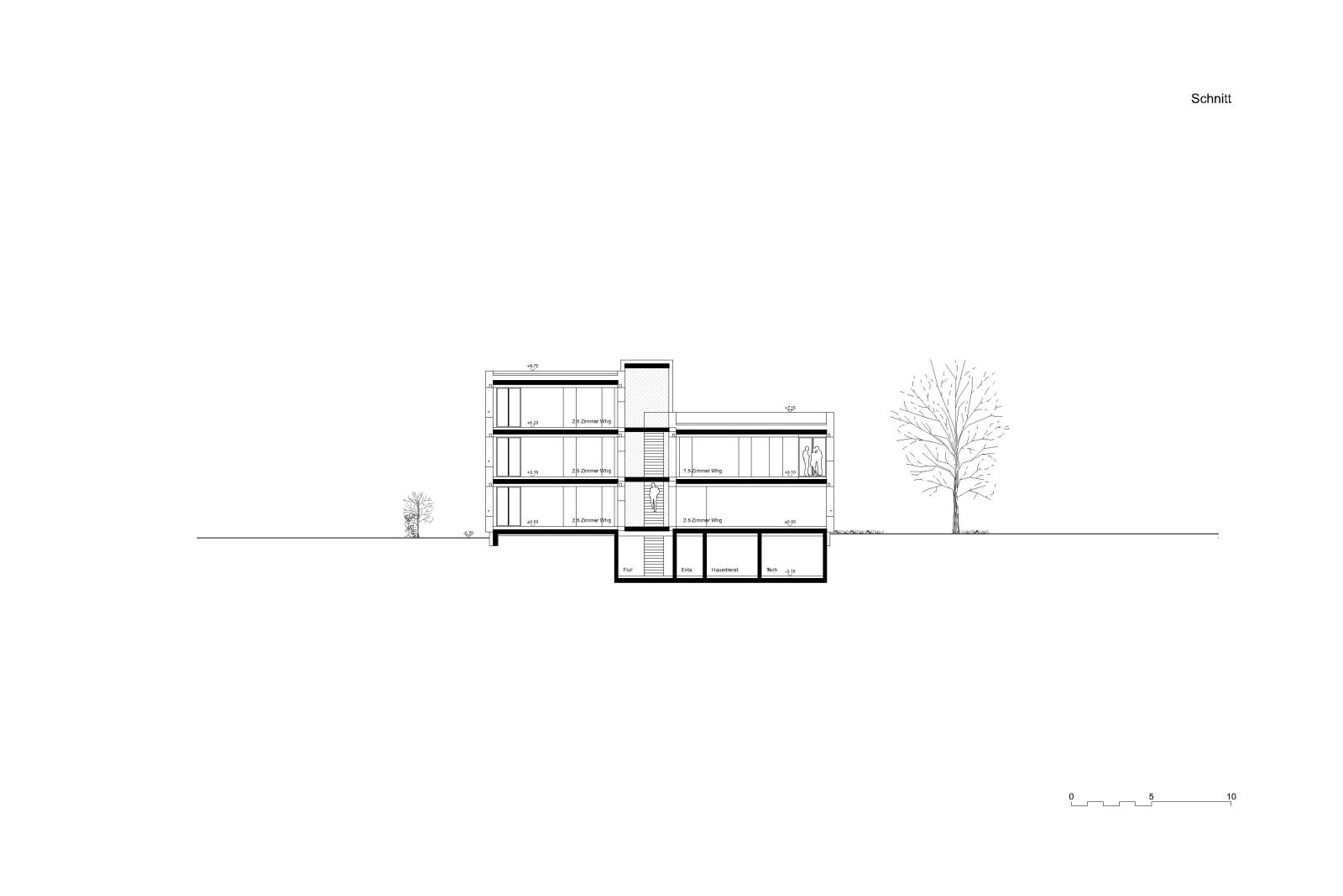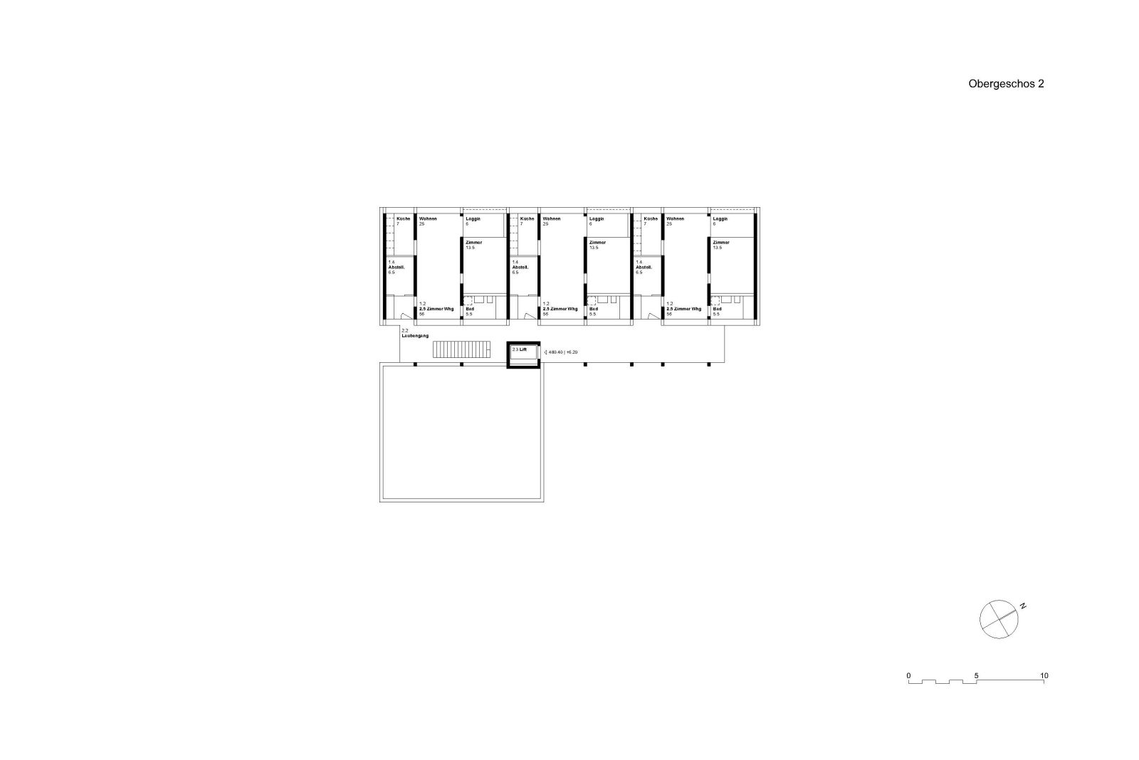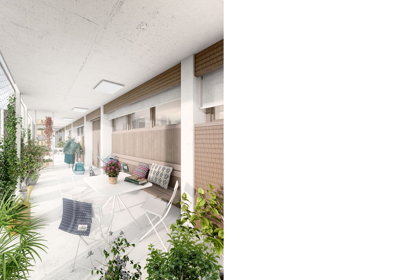 Die Baukörper weisen sowohl Aussen als auch Innen eine einfache Struktur auf. Die Wohnungen sind in ihrer Grösse auf zwei Baukörper aufgeteilt und gliedern sich in einzelne Schotten. Ein offener Laubengang als Erschliessung dient als zusätzlicher Aussenraum, Begegnungszone sowie als halböffentliche Verbindung der Aussenräume. Dadurch können die Erschliessungsflächen zu den Wohnungen minimiert und doch belebt werden. Obwohl die Burgseite wenige Sonnenstrahlen generiert weist der Ort eine grosse Qualität auf.