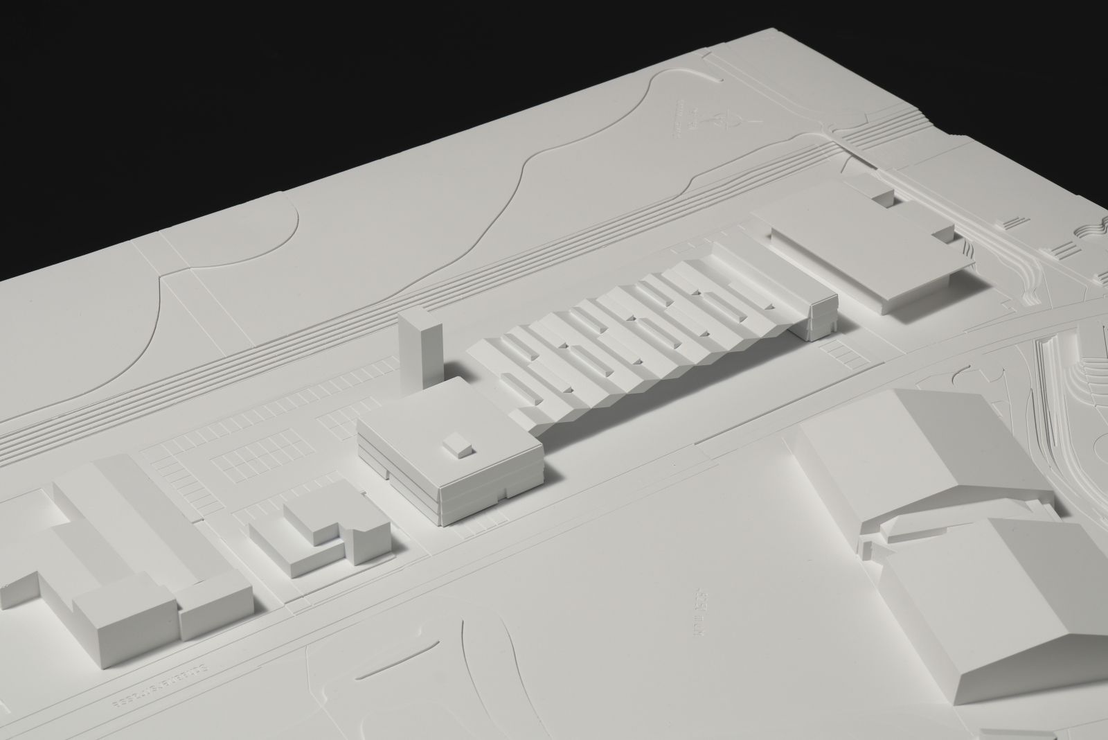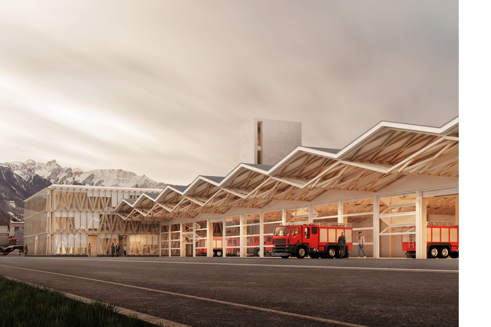 Prägnant und selbstbewusst, stark und eigenständig, zurückhaltend und selbstverständlich integriert sich das neue Feuerwehrdepot in seine Umgebung. Präzise gesetzte Eingriffe klären die Situation. Das Gebäude vermittelt zwischen den unterschiedlichen Massstäben des Ortes, hat gleichzeitig eine angemessene Strahlkraft und bildet einen neuen, unverwechselbaren Ort. Der Baukörper weist eine grosszügige Form auf - eine offene Struktur, welche nutzungsneutral und flexibel bespielt werden kann. Das prägende Gebäudevolumen für die Geometrie des bestehenden Gewerbeareals in einer selbstverständlichen Art und Weise weiter. Der südliche Kopfbau der Feuerwehr liegt städtebaulich vorgesetzt an der Schaanerstrasse und nimmt die bestehenden Gebäudefluchten auf.