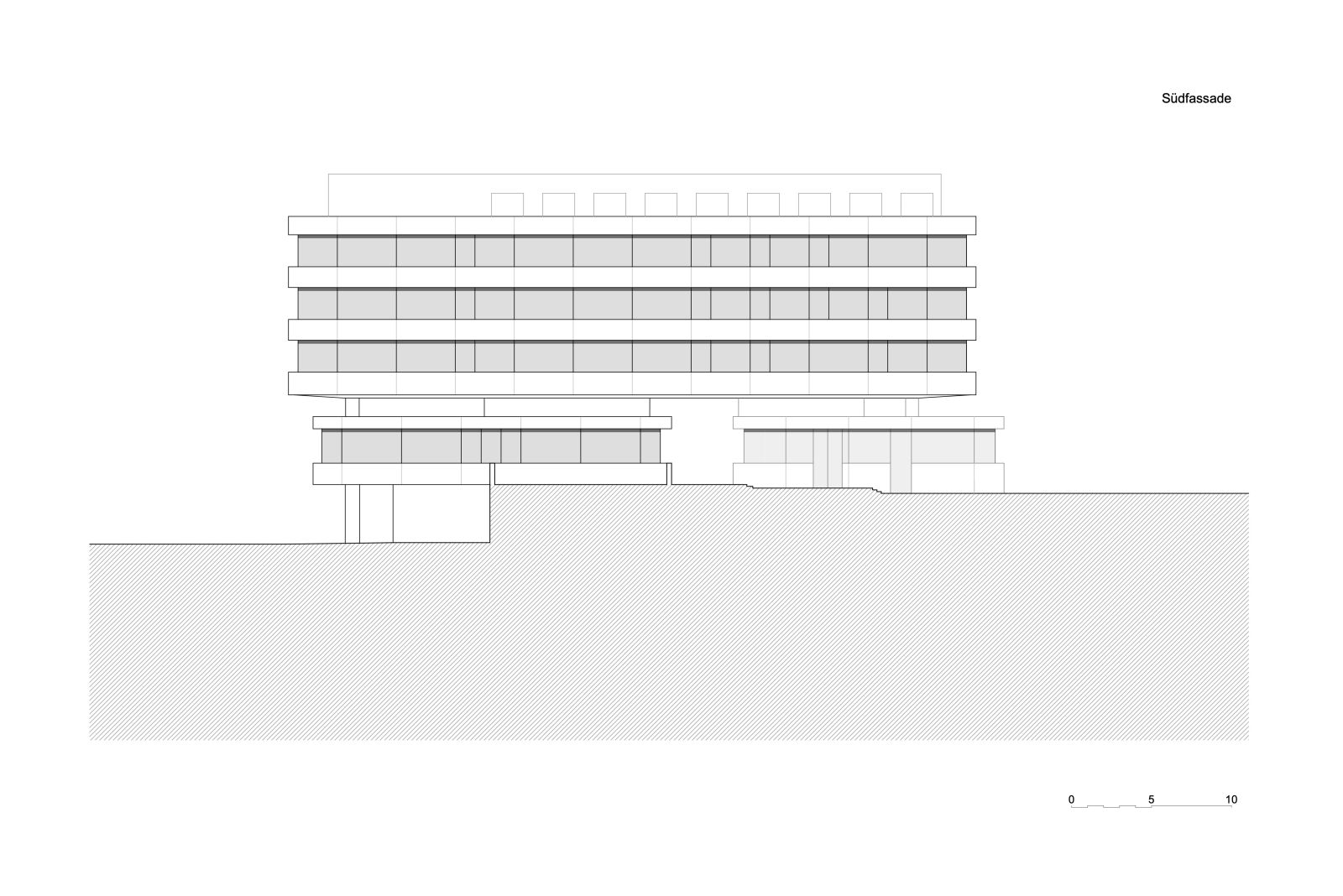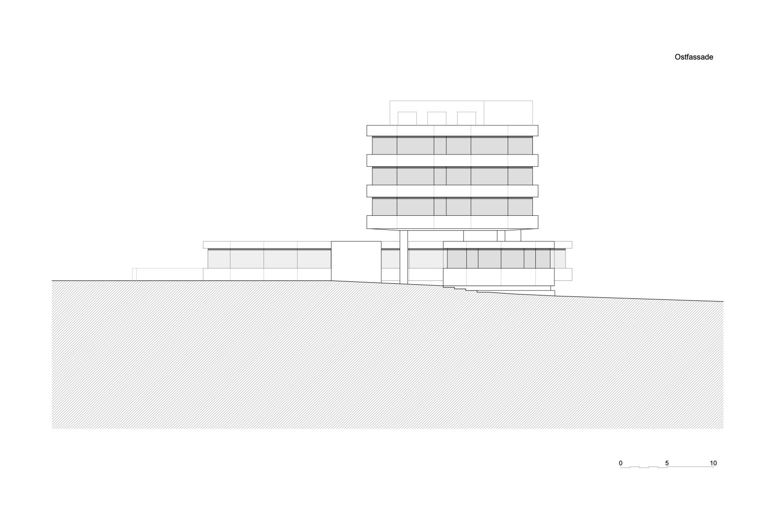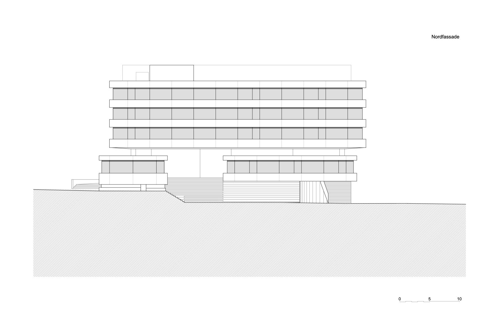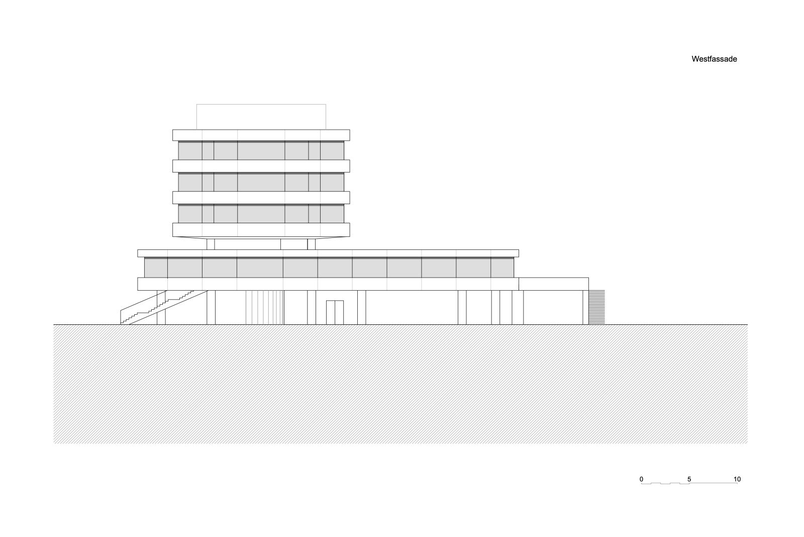Die unglaublich starke visuelle Kraft des Rohbaus wird auf alten Baustellenfotos deutlich. Klare einfache Strukturen und eine schlichte Formensprache machen diese Kraft aus. Zu dieser soll mit dem Projektentwurf zurückgefunden werden. Der Bestand wird auf seine Grundstruktur rückgebaut. Die visuell prägende Plattenstruktur des Rohbaus soll nun deutlich sichtbar werden. Die Bänder der Geschossdecken sowie die Stützen im Innern sind formgebend für das neue Gebäude und geben ihm seine dynamische Wirkung. Durch eine Erweiterung der vertikalen Struktur wird das Konzept des Bestandes gestärkt. Die Fassade wird in reduzierter Art neu gestaltet und energetisch in das Haustechnikkonzept einbezogen. Die Treppenkerne bleiben erhalten und werden räumlich ergänzt. Einfache, klare Grundstrukturen die durch eine flexible Möblierung bespielt werden können. Dadurch kann der Grundriss möglichst frei gestaltet werden und ist für zukünftige Änderungen vorbereitet.