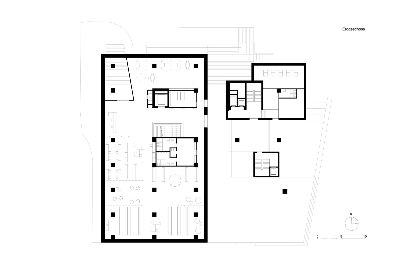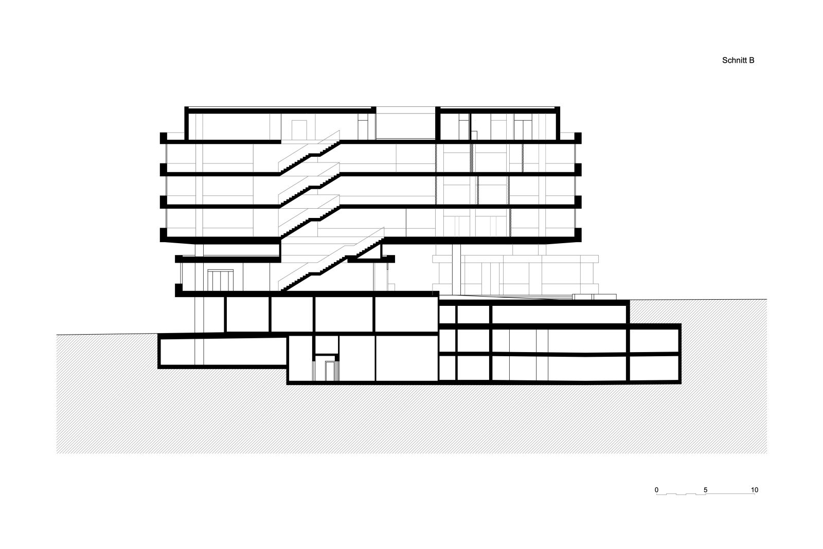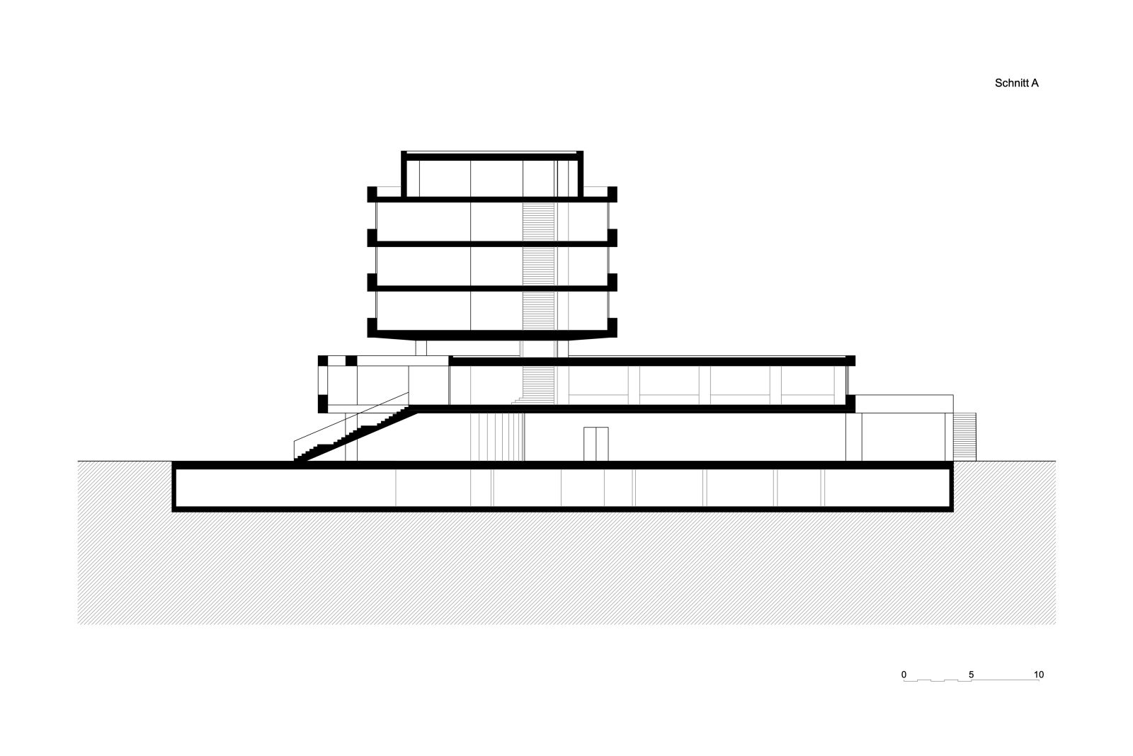 Die unglaublich starke visuelle Kraft des Rohbaus wird auf alten Baustellenfotos deutlich. Klare einfache Strukturen und eine schlichte Formensprache machen diese Kraft aus. Zu dieser soll mit dem Projektentwurf zurückgefunden werden. Der Bestand wird auf seine Grundstruktur rückgebaut. Die visuell prägende Plattenstruktur des Rohbaus soll nun deutlich sichtbar werden. Die Bänder der Geschossdecken sowie die Stützen im Innern sind formgebend für das neue Gebäude und geben ihm seine dynamische Wirkung. Durch eine Erweiterung der vertikalen Struktur wird das Konzept des Bestandes gestärkt. Die Fassade wird in reduzierter Art neu gestaltet und energetisch in das Haustechnikkonzept einbezogen. Die Treppenkerne bleiben erhalten und werden räumlich ergänzt. Einfache, klare Grundstrukturen die durch eine flexible Möblierung bespielt werden können. Dadurch kann der Grundriss möglichst frei gestaltet werden und ist für zukünftige Änderungen vorbereitet.