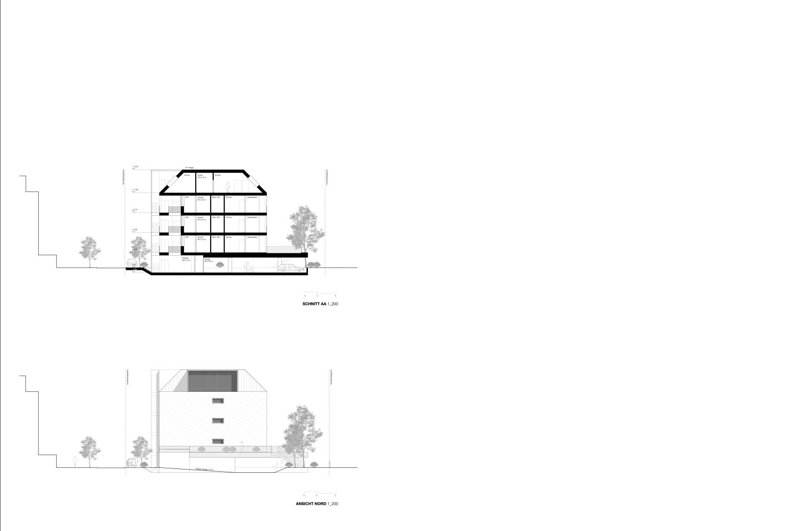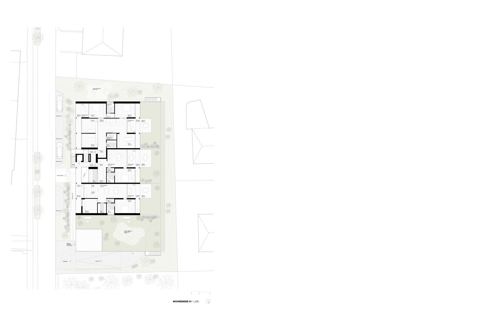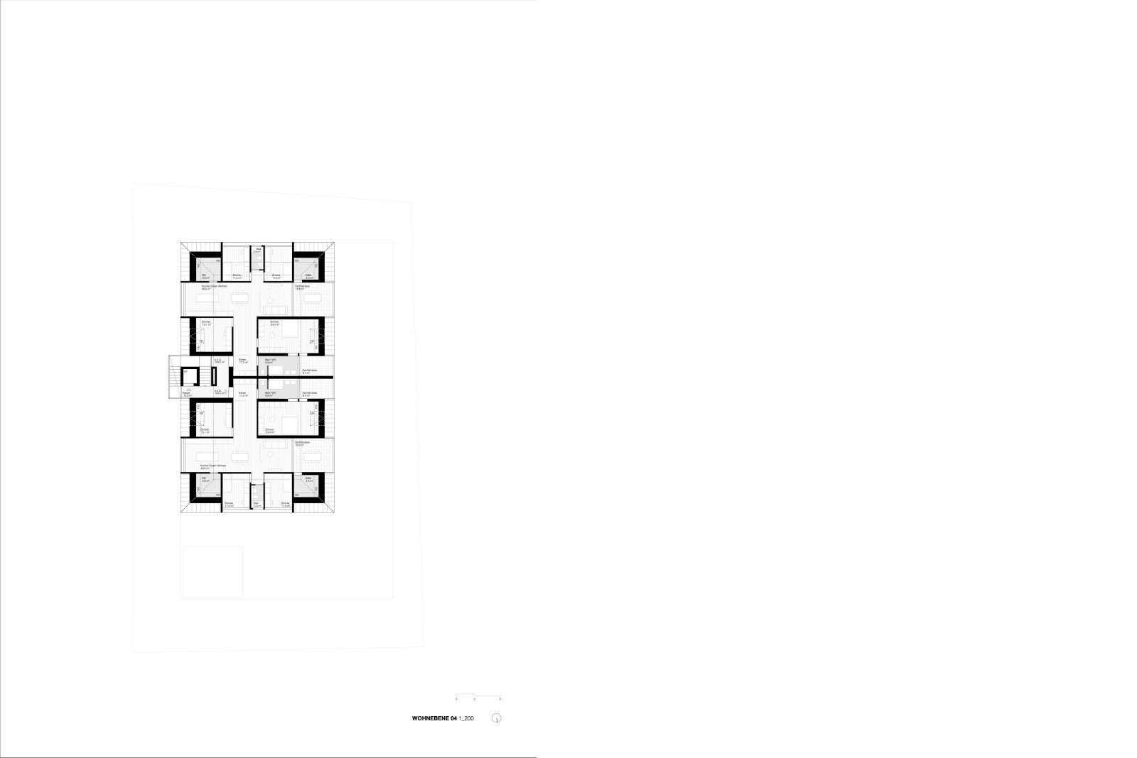Die Gliederung des Baukörpers wurde von der Idee geleitet, eine schlichte Architektur zu schaffen, die keine klar definierte Hinter- oder Vorderseite aufweist. Vielmehr wurde ein Gebäude konzipiert, in welchem beide Himmelsrichtungen Ost Schlosswald als auch West Ried von gleichwertiger Bedeutung sind. Neben dem Konstruktionsraster wurden Ausblicke und Himmelsrichtungen nicht nur als räumliche Orientierung, sondern auch programmatisch, energetisch und architektonisch in die Gestaltung integriert. Der Ost-West Bezug erzeugt gleichwertige Wohnqualitäten und ermöglicht eine natürliche Querlüftung.