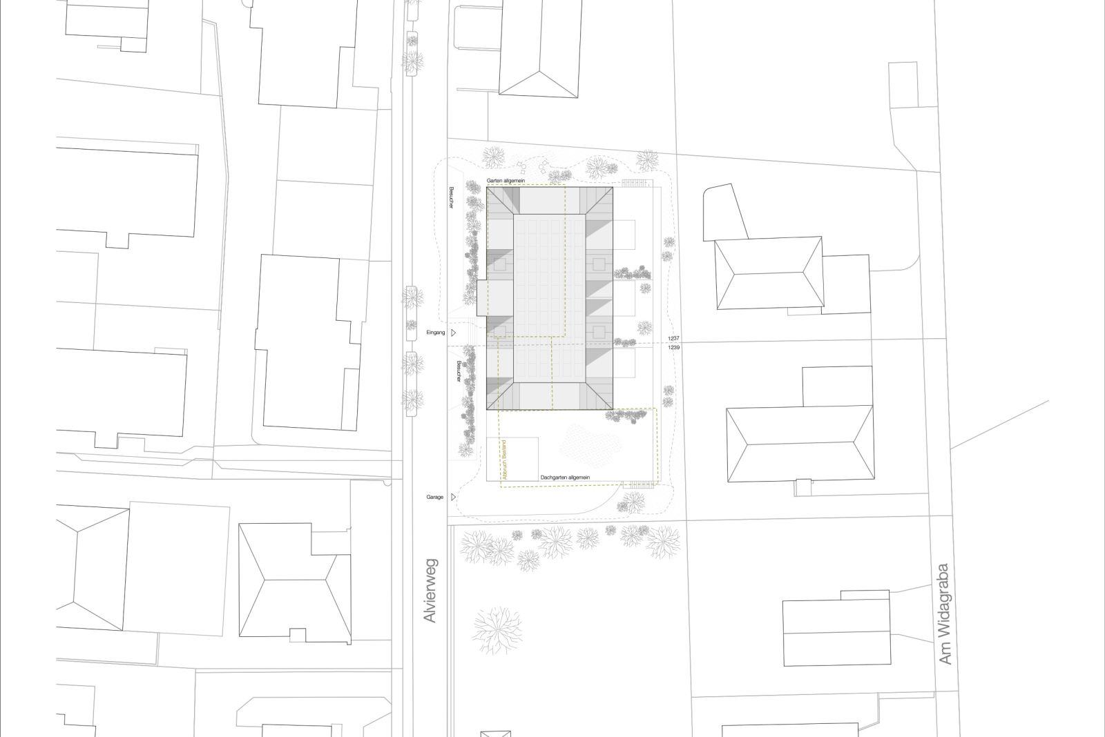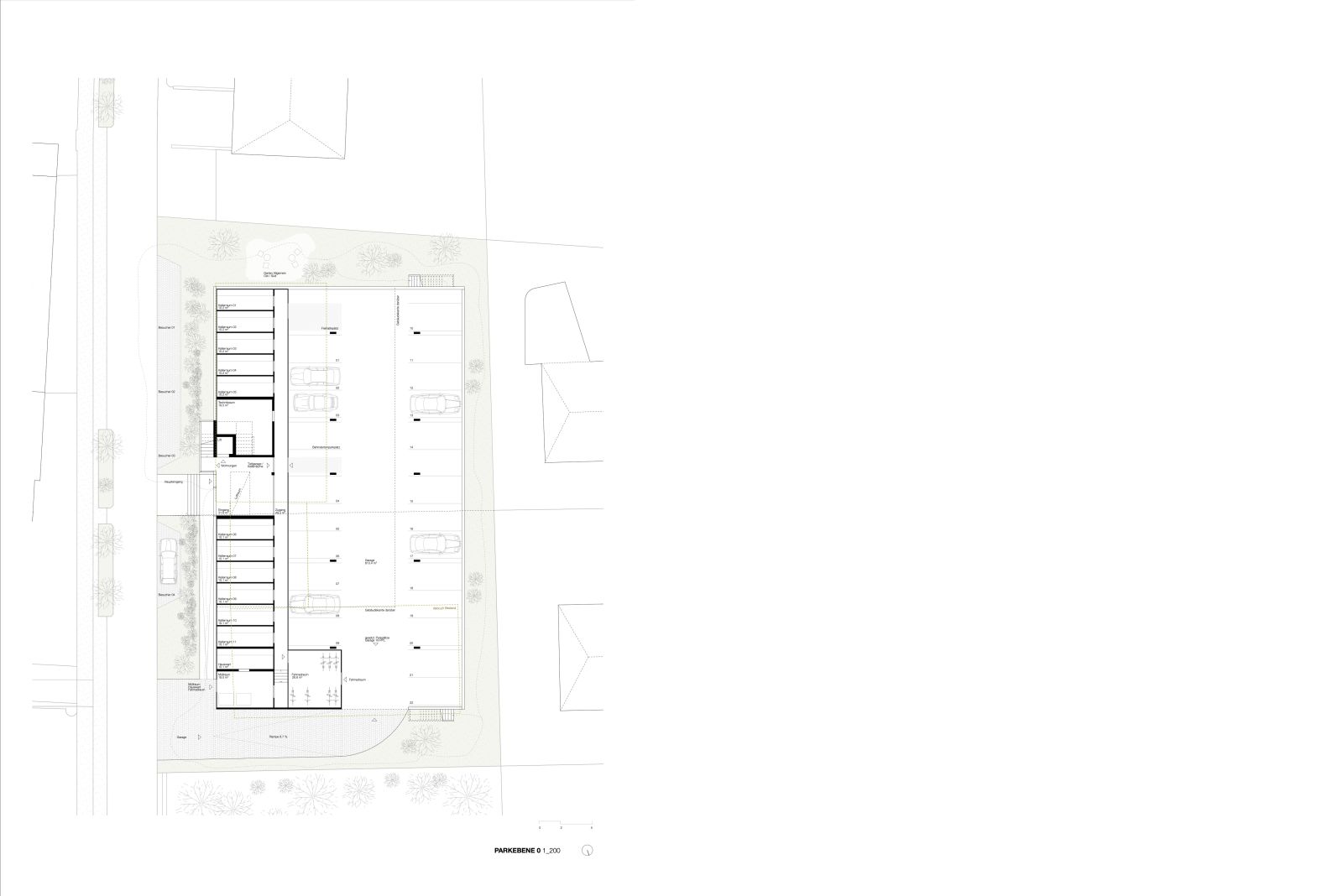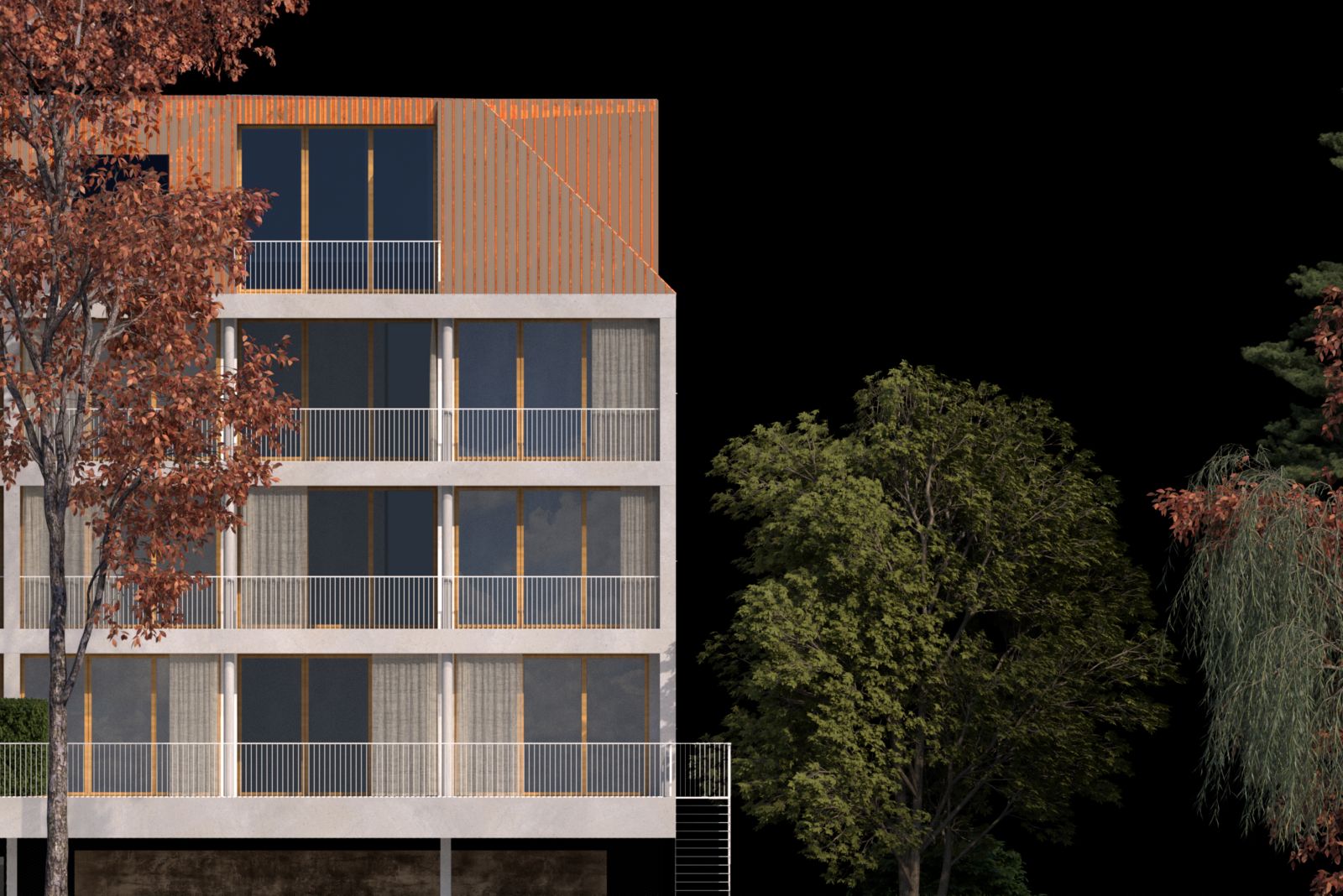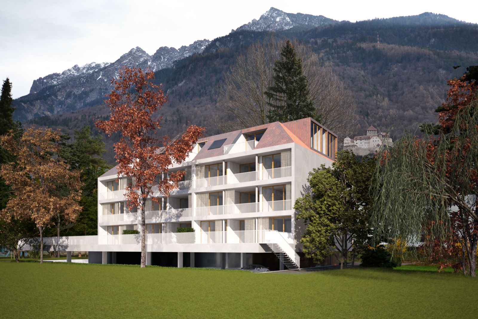 Die Gliederung des Baukörpers wurde von der Idee geleitet, eine schlichte Architektur zu schaffen, die keine klar definierte Hinter- oder Vorderseite aufweist. Vielmehr wurde ein Gebäude konzipiert, in welchem beide Himmelsrichtungen Ost Schlosswald als auch West Ried von gleichwertiger Bedeutung sind. Neben dem Konstruktionsraster wurden Ausblicke und Himmelsrichtungen nicht nur als räumliche Orientierung, sondern auch programmatisch, energetisch und architektonisch in die Gestaltung integriert. Der Ost-West Bezug erzeugt gleichwertige Wohnqualitäten und ermöglicht eine natürliche Querlüftung.