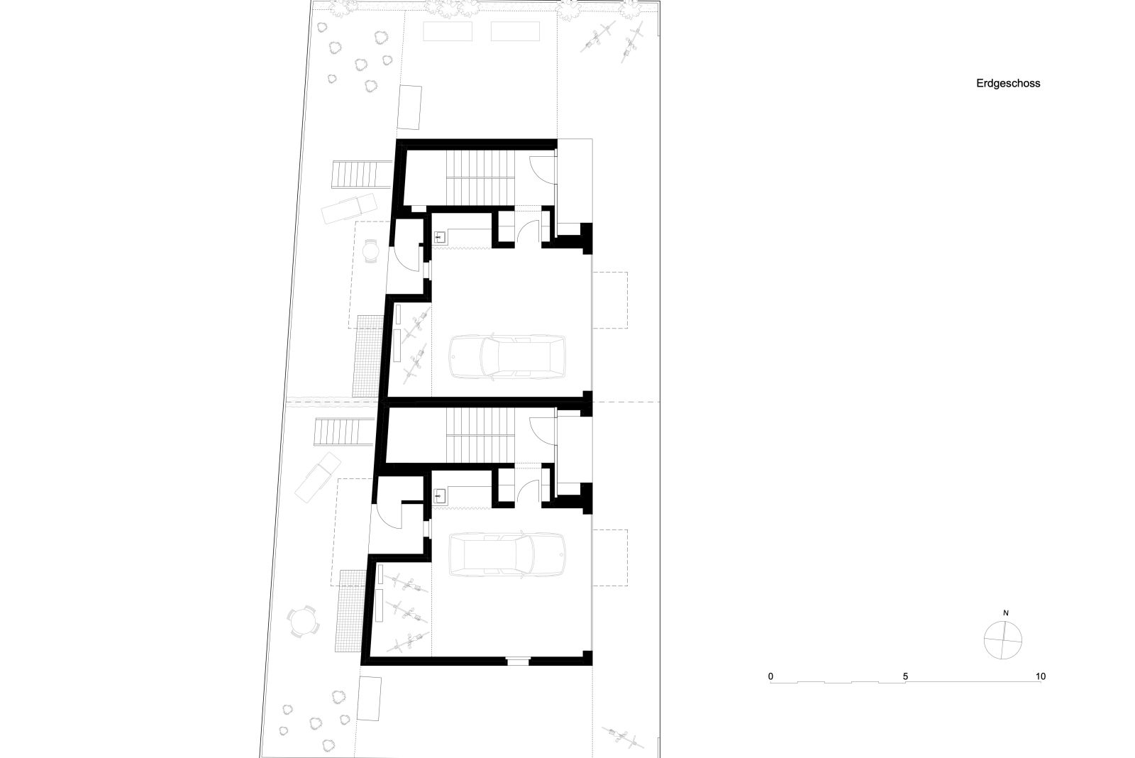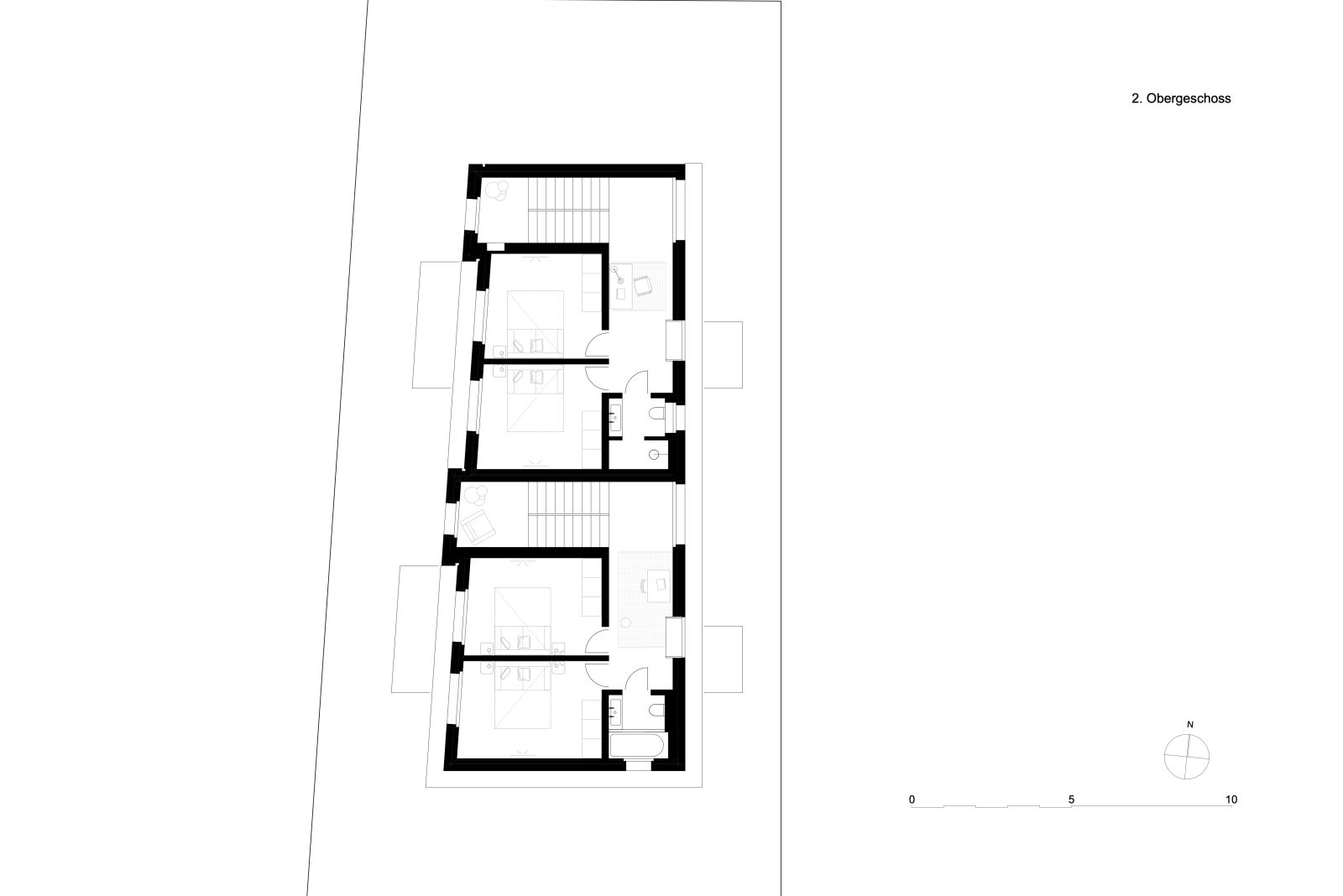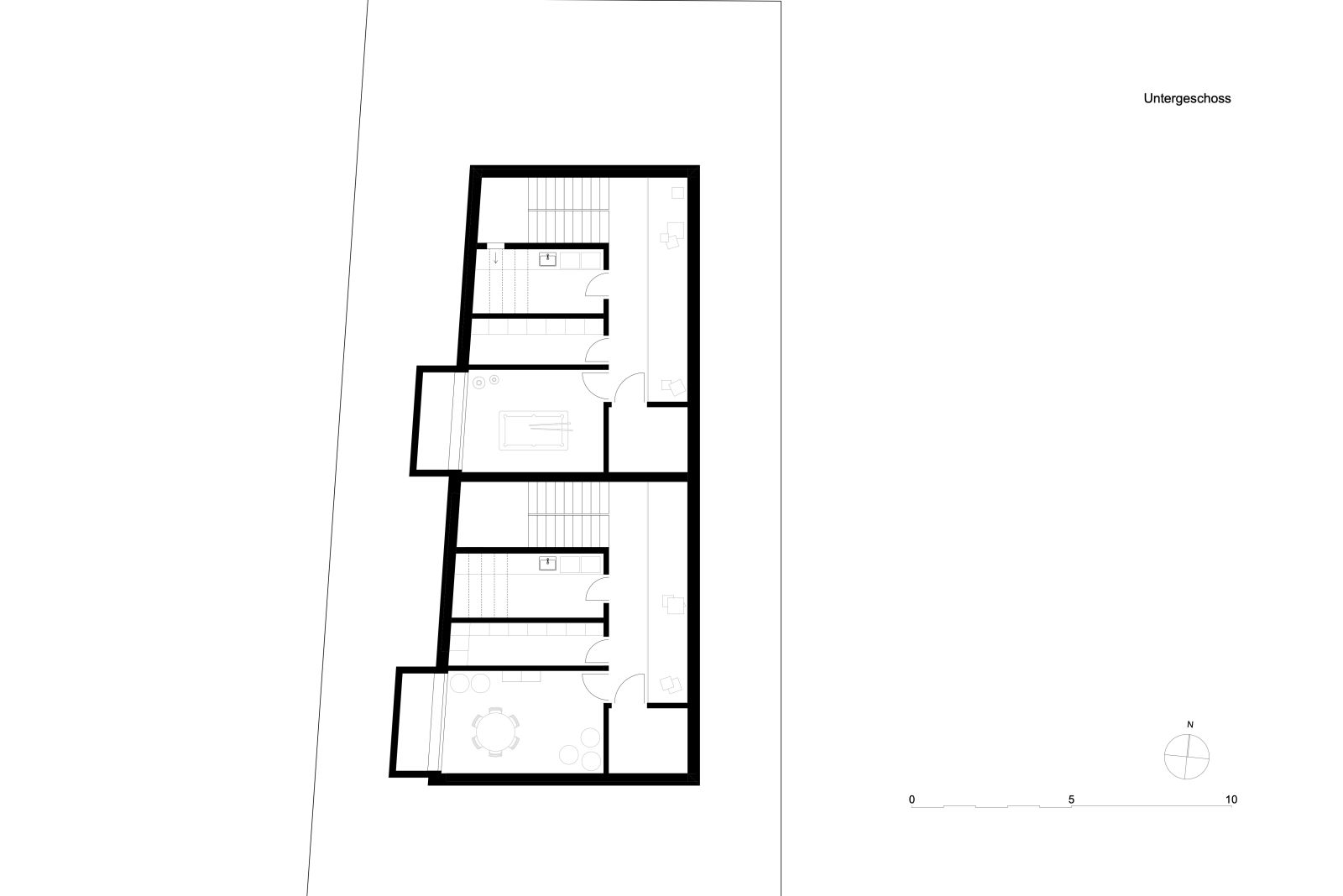 Das langgezogene Grundstück ist mit einem bestehenden Mehrfamilienhaus bebaut. Neu entstehen zwei Reihenhäuser welche sowohl die Qualitäten eines Einfamilienhauses als auch die Vorzüge vom Wohnungsbau aufzeigen. Durch die schmale Grundlage der Parzelle ist der Entwurf in mehreren Ansichten gefordert. Mit Rücksprüngen und Einzügen schafft es der Baukörper sowohl dem Baugesetz gerecht zu werden als auch die Innenräume angemessen zu bespielen.