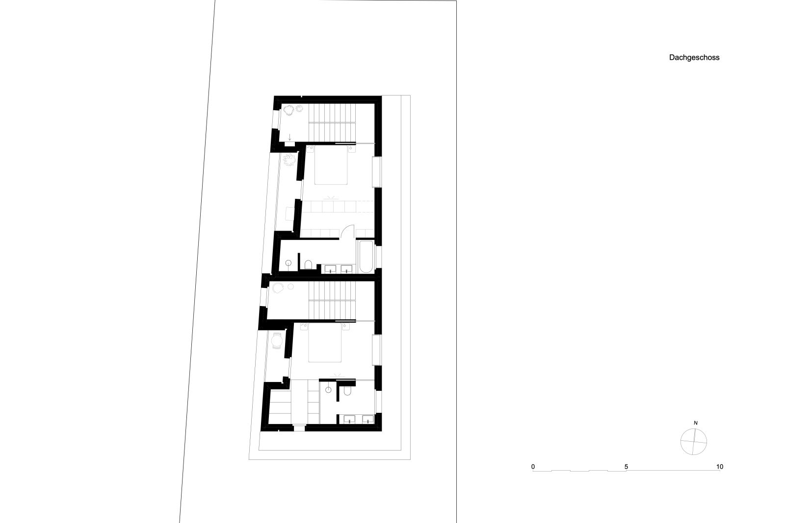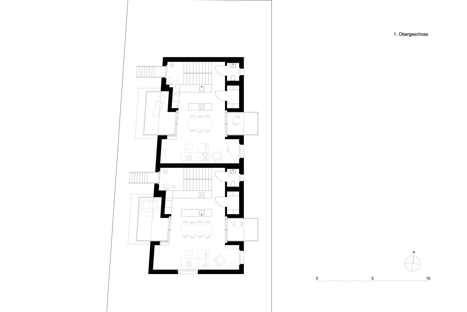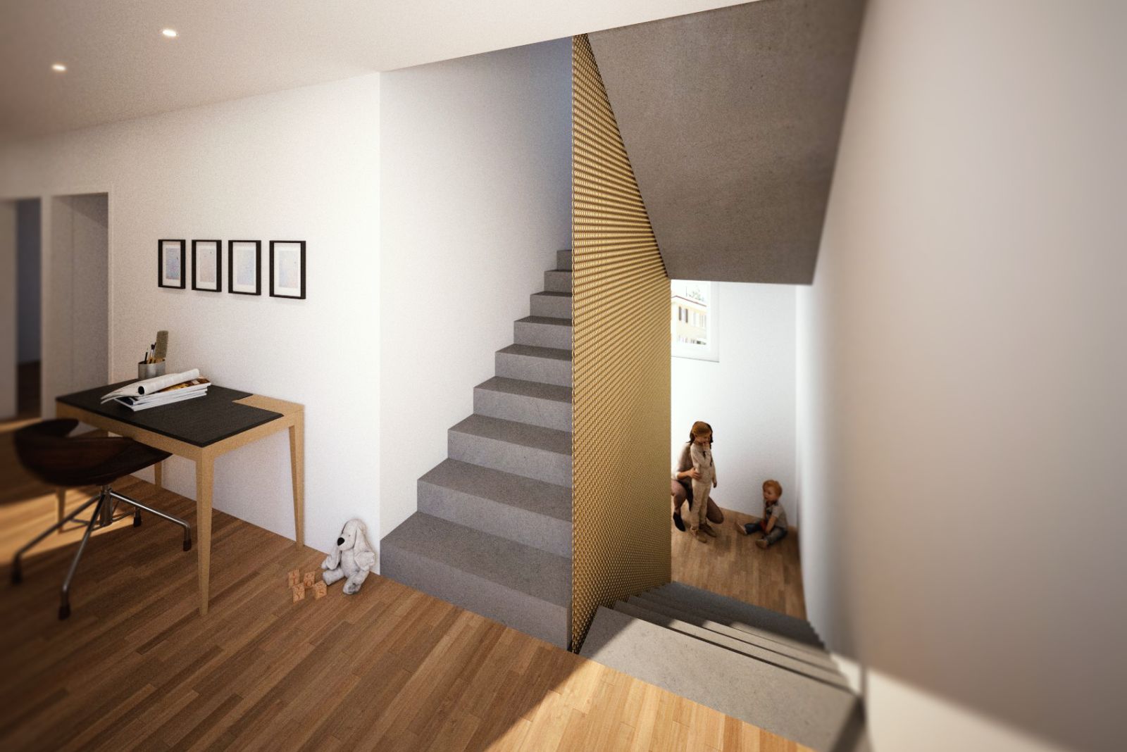 Das langgezogene Grundstück ist mit einem bestehenden Mehrfamilienhaus bebaut. Neu entstehen zwei Reihenhäuser welche sowohl die Qualitäten eines Einfamilienhauses als auch die Vorzüge vom Wohnungsbau aufzeigen. Durch die schmale Grundlage der Parzelle ist der Entwurf in mehreren Ansichten gefordert. Mit Rücksprüngen und Einzügen schafft es der Baukörper sowohl dem Baugesetz gerecht zu werden als auch die Innenräume angemessen zu bespielen.